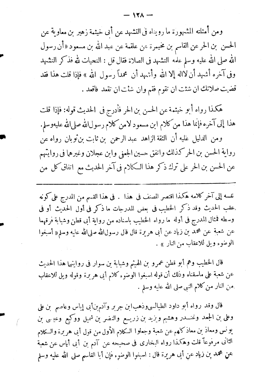 ومن أمثلته المشهورة: ما رويناه في التشهد عن أبي خيثمة زهير بن معاوية عن الحسن بن الحر عن القاسم بن مخيمرة عن علقمة عن عبد الله بن مسعود: أن رسول الله صلى الله عليه وسلم علمه التشهد في الصلاة فقال: "قل: التحيات لله.." فذكر التشهد وفي آخره: "أشهد أن لا إله إلا الله وأشهد أن محمدا رسول الله فإذا قلت هذا فقد قضيت صلاتك إن شئت أن تقوم فقم وإن شئت أن تقعد فاقعد".