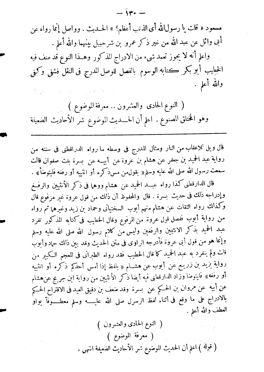 قال ويل للاعقاب من النار ومثال المدرج في وسطه ما رواه الدارقطنى في سننه من رواية عبد الحميد بن جعفر عن هشام بن عروة عن أبيه عن بسرة بنت صفوان قالت سمعت رسول الله صلى الله عليه وسلم يقول: "من مس ذكره أو أنثييه أو رفعه فليتوضأ".