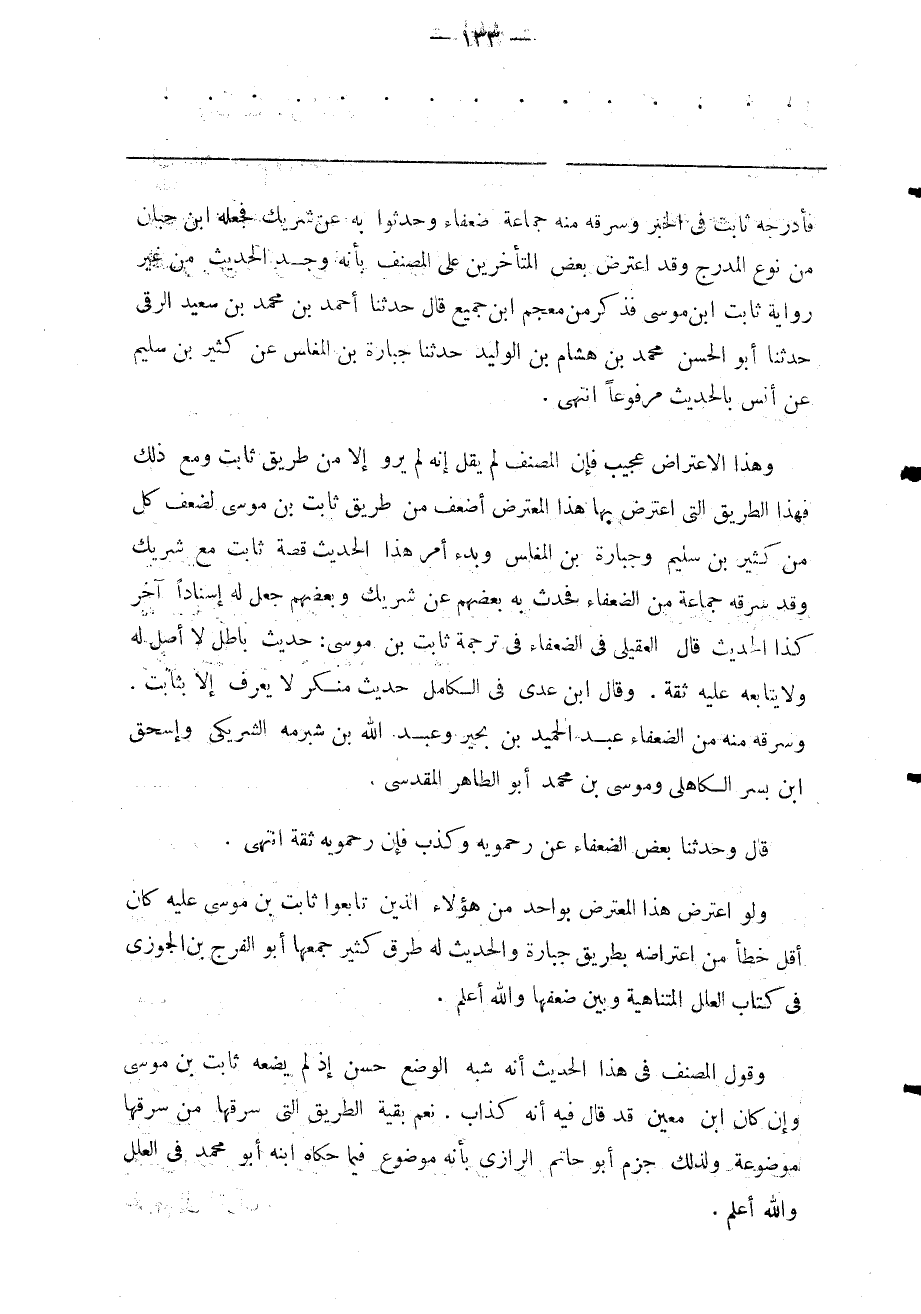 ولو اعترض هذا المعترض بواحد من هؤلاء الذين تابعوا ثابت بن موسى عليه كان أقل خطأ من اعتراضه بطريق جبارة والحديث له طرق كثير جمعها أبو الفرج بن الجوزى في كتاب العلل المتناهية وبين ضعفها والله أعلم.