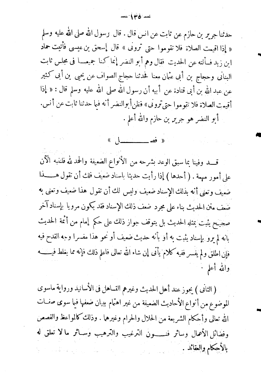 قد وفينا بما سبق الوعد بشرحه من إلانواع الضعيفة والحمد لله فلننبه إلان على أمور مهمة: أحدها: إذا رأيت حديثا بإسناد ضعيف فلك أن تقول هذا ضعيف وتعني أنه بذلك الإسناد ضعيف. وليس لك أن تقول هذا ضعيف وتعني به ضعف متن الحديث بناء على مجرد ضعف ذلك الإسناد فقد يكون مرويا بإسناد آخر صحيح يثبت بمثله الحديث. بل يتوقف جواز ذلك على حكم إمام من أئمة الحديث بأنه لم يرو بإسناد يثبت به أو بأنه حديث ضعيف أو نحو هذا مفسرا وجه القدح فيه. فإن أطلق ولم يفسر ففيه كلام يأتي إن شاء الله تعالى فاعلم ذلك فإنه مما يغلط فيه والله اعلم.