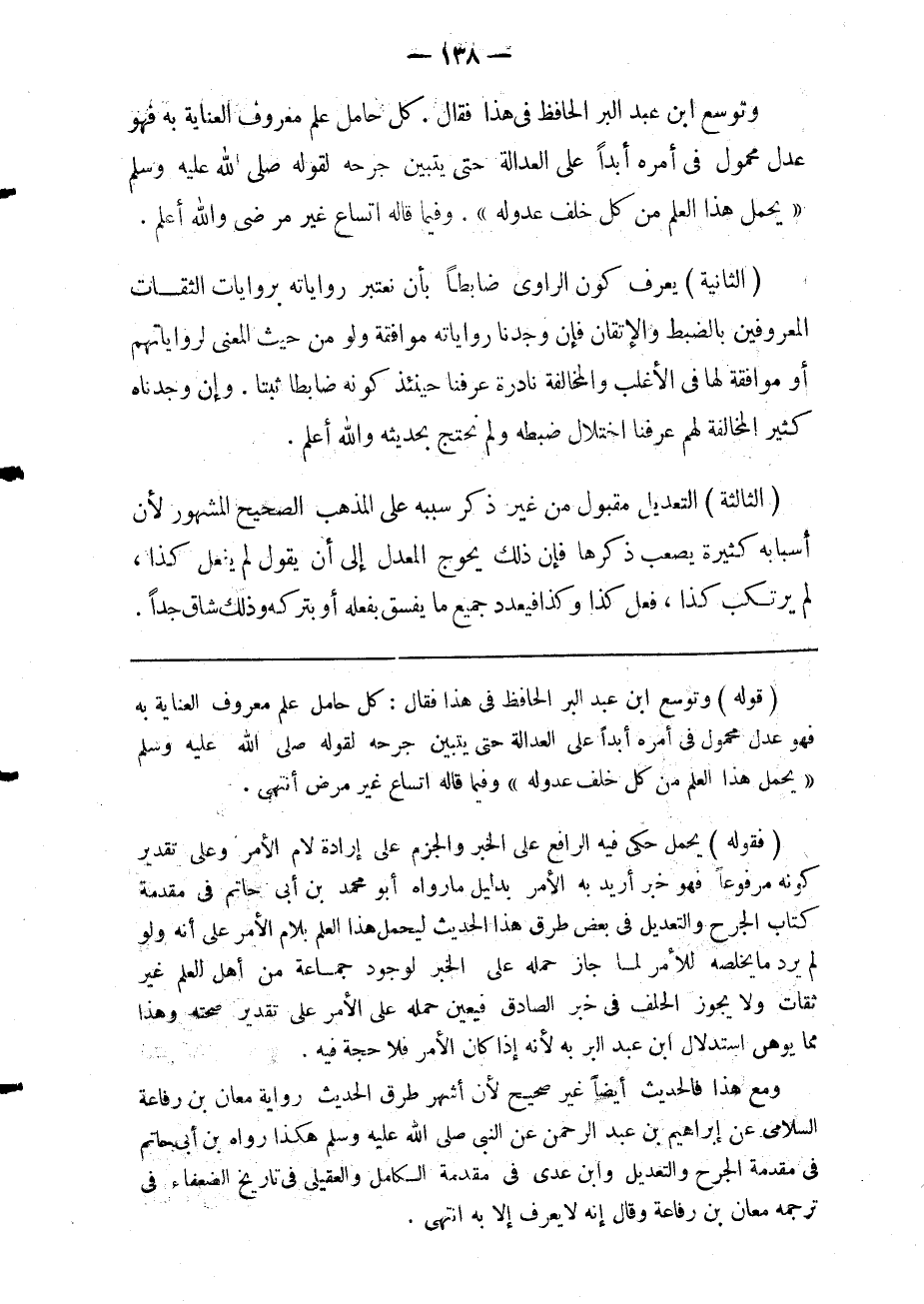 وتوسع ابن عبد البر الحافظ في هذا فقال: كل حامل علم معروف العناية به فهو عدل محمول في أمره أبدا على العدالة حتى يتبين جرحه. لقوله صلى الله عليه وسلم: "يحمل هذا العلم من كل خلف عدوله". وفيما قاله اتساع غير مرضي والله اعلم.