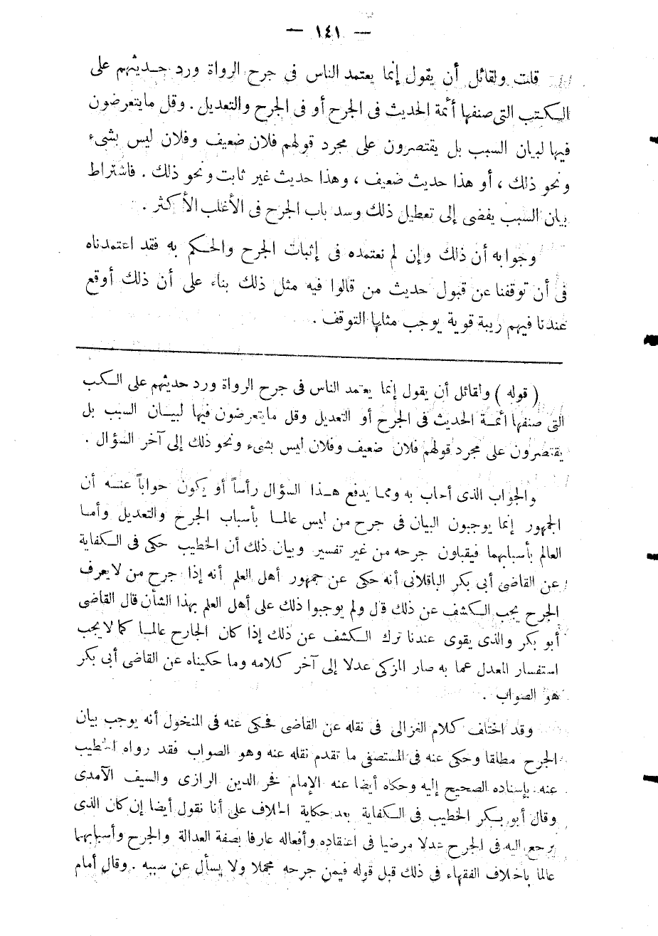 قلت: ولقائل أن يقول: إنما يعتمد الناس في جرح الرواة ورد حديثهم على الكتب التي صنفها أئمة الحديث في الجرح أو في الجرح والتعديل. وقل ما يتعرضون فيها لبيان السبب بل يقتصرون على مجرد قولهم: فلان ضعيف وفلان ليس بشيء ونحو ذلك. أو: هذا حديث ضعيف وهذا حديث غير ثابت ونحو ذلك. فاشتراط بيان السبب يفضي إلى تعطيل ذلك وسد باب الجرح في الأغلب الأكثر.