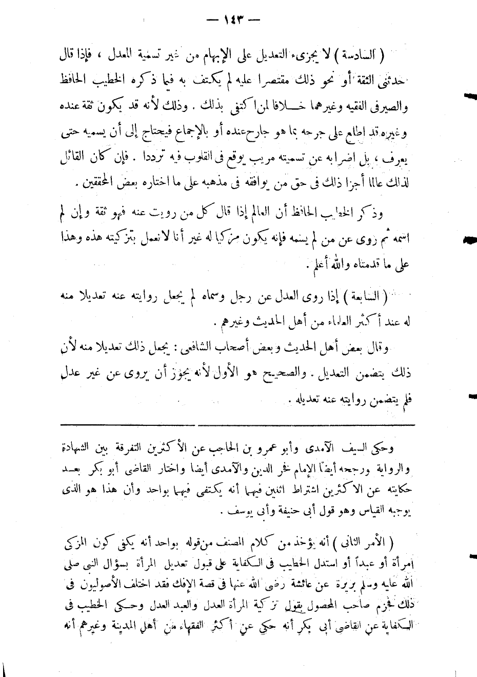 السادسة: لا يجزي التعديل على لإبهام من غير تسمية المعدل فإذا قال: حدثني الثقة أو نحو ذلك مقتصرا عليه لم يكتف به فيما ذكره الخطيب الحافظ والصيرفي الفقيه وغيرهما. خلافا لمن اكتفي بذلك. وذلك: لأنه قد يكون ثقة عنده وغيره قد اطلع على جرحه بما هو جارح عنده أو بالإجماع فيحتاج إلى أن يسميه حتى يعرف. بل إضرابه عن تسميته مريب يوقع في القلوب فيه ترددا. فإن كان القائل لذلك عالما أجزأ ذلك في حق من يوافقه في مذهبه على ما اختاره بعض المحققين.