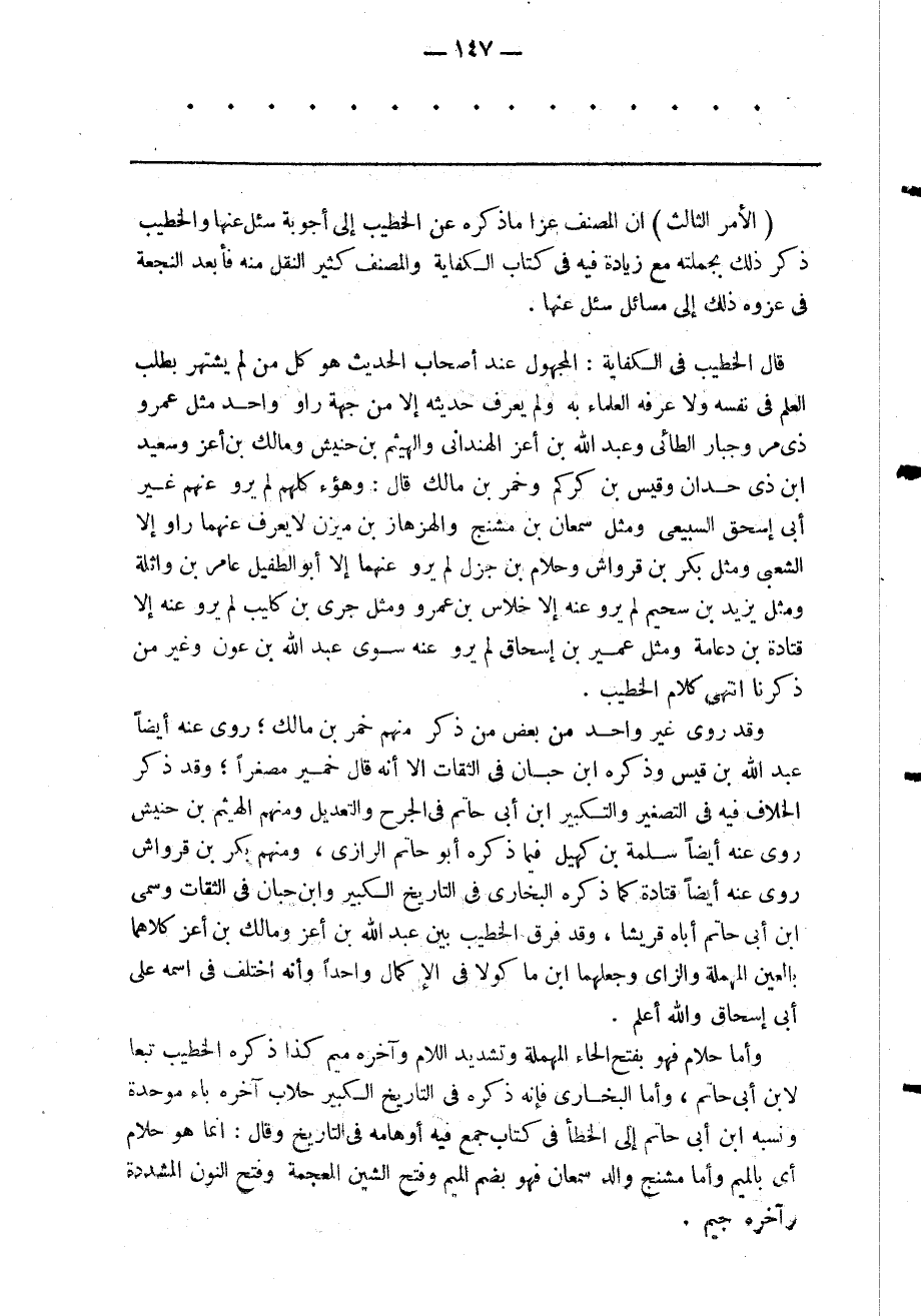 الأمر الثالث ان المصنف عزا ما ذكره عن الخطيب إلى أجوبة سئل عنها والخطيب ذكر ذلك بجملته مع زيادة فيه في كتاب الكفاية والمصنف كثير النقل منه فأبعد النجعة في عزوه ذلك إلى مسائل سئل عنها.