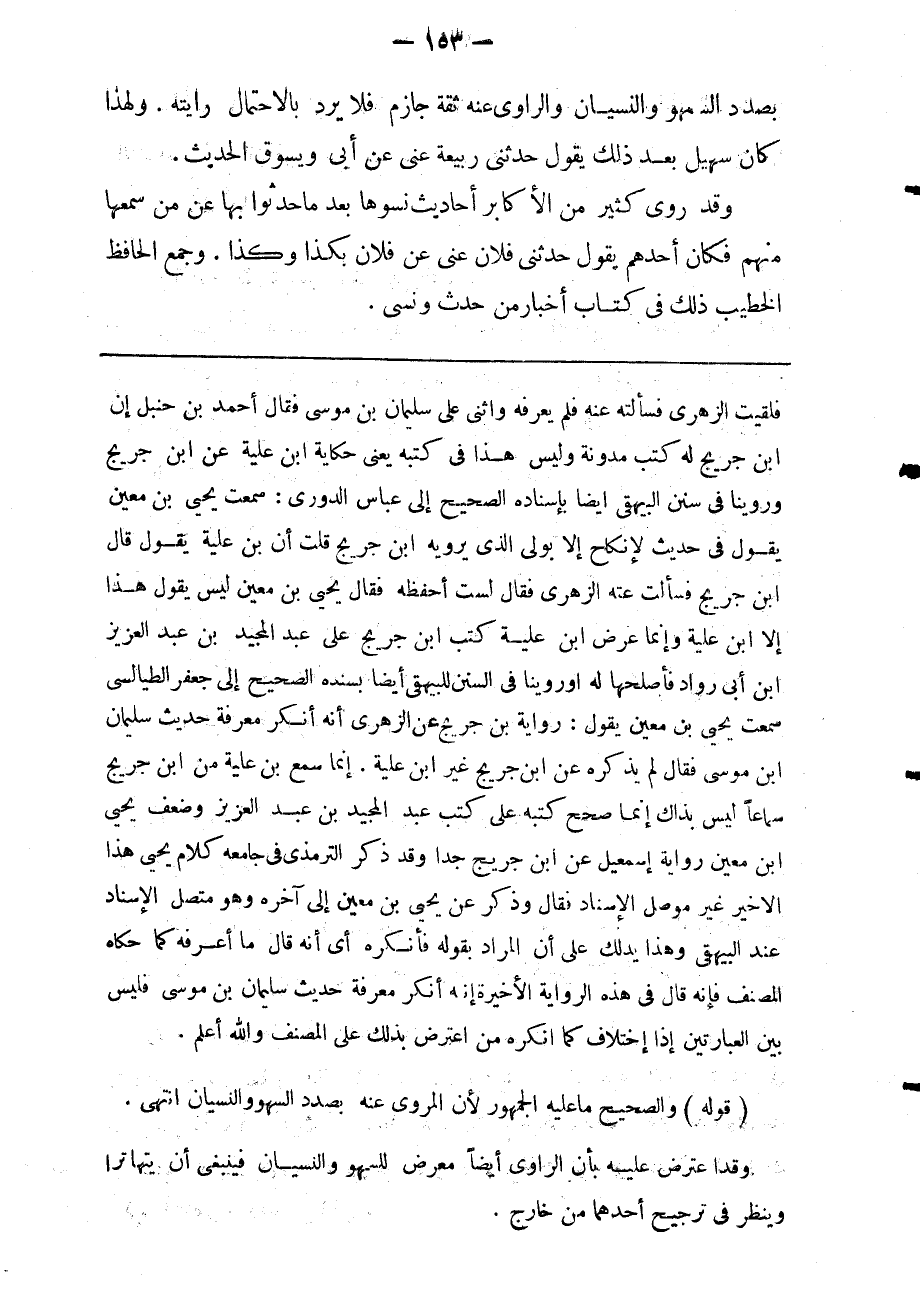 فلقيت الزهرى فسألته عنه فلم يعرفه واثنى على سليمان بن موسى فقال أحمد بن حنبل إن ابن جريج له كتب مدونة وليس هذا في كتبه يعنى حكاية ابن علية عن ابن جريج وروينا في سنن البيهقى ايضا بإسناده الصحيح إلى عباس الدورى سمعت يحيى بن معين يقول في حديث لا نكاح إلا بولى الذى يرويه ابن جريج قلت أن بن علية يقول قال ابن جريج فسألت عنه الزهرى فقال لست أحفظه فقال يحيى بن معين ليس يقول هذا إلا ابن علية وإنما عرض ابن علية كتب ابن جريج على عبد المجيد بن عبد العزيز ابن أبى رواد فأصلحها له أوروينا في السنن للبيهقى أيضا بسنده الصحيح إلى جعفر الطيالسى سمعت يحيى بن معين يقول رواية بن جريج عن الزهرى أنه أنكر معرفة حديث سليمان ابن موسى فقال لم يذكره عن ابن جريج غير ابن علية إنما سمع بن علية من ابن جريج سماعا ليس بذلك إنما صحح كتبه على كتب عبد المجيد بن عبد العزيز وضعف يحيى ابن معين رواية إسمعيل عن ابن جريج جدا وقد ذكر الترمذى في جامعه كلام يحيى هذا الاخير غير موصل الإسناد فقال وذكر عن يحيى بن معين إلى آخره وهو متصل الإسناد عند البيهقى وهذا يدلك على أن المراد بقوله فأنكره أى أنه قال ما أعرفه كما حكاه المصنف فإنه قال في هذه الرواية الأخيرة إنه أنكر معرفة حديث سليمان بن موسى فليس بين العبارتين إذا إختلاف كما انكره من اعترض بذلك على المصنف والله أعلم.