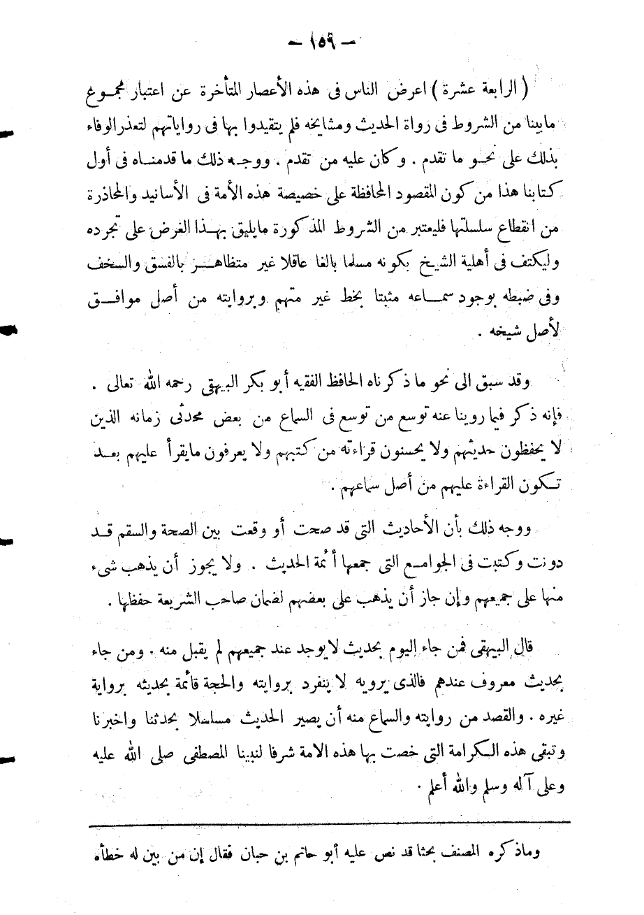 الرابعة عشرة: أعرض الناس في هذه إلاعصار المتأخرة عن اعتبار مجموع ما بينا من الشروط في رواة الحديث ومشايخه فلم يتقيدوا بها في رواياتهم لتعذر الوفاء بذلك على نحو ما تقدم وكان عليه من تقدم ووجه ذلك: ما قدمنا في أول كتابنا هذا من كون المقصود المحافظة على خصيصة هذه إلامة في إلاسانيد والمحاذرة من انقطاع سلسلتها. فليعتبر من الشروط المذكورة ما يليق بهذا الغرض على تجرده. وليكتف في أهلية الشيخ بكونه: مسلما بالغا عاقلا غير متظاهر بالفسق والسخف وفي ضبطه: بوجود سماعه مثبتا بخط غير مهتم وبروايته من أصل موافق لأصل شيخه.
