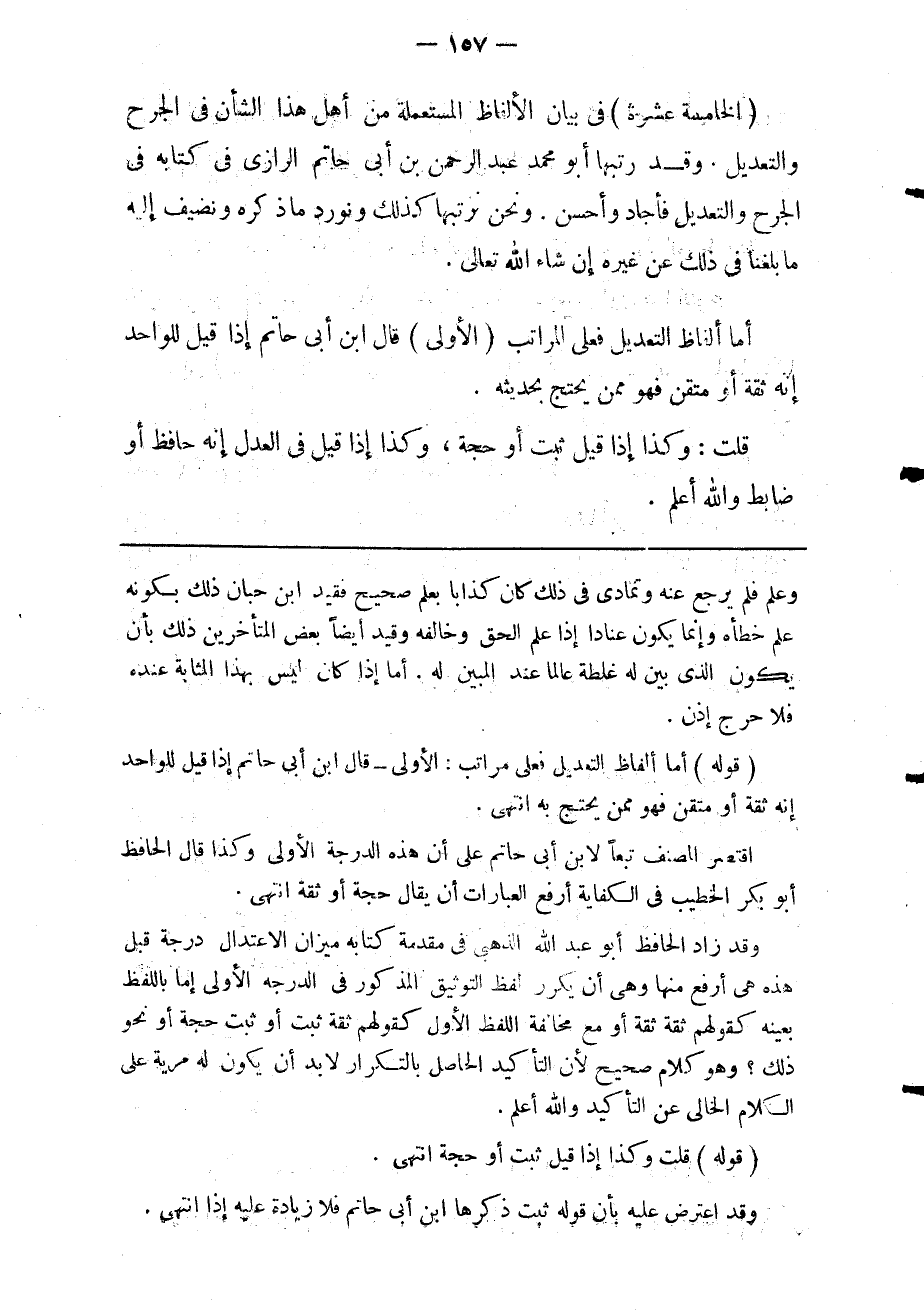 الخامسة عشر: في بيان إلالفاظ المستعملة بين أهل هذا الشأن في الجرح والتعديل. وقد رتبها أبو محمد عبد الرحمن بن أبي حاتم الرازي في كتابه الجرح والتعديل فأجاد وأحسن. ونحن نرتبها كذلك ونورد ما ذكره ونضيف إليه ما بلغنا في ذلك عن غيره إن شاء الله تعالى.