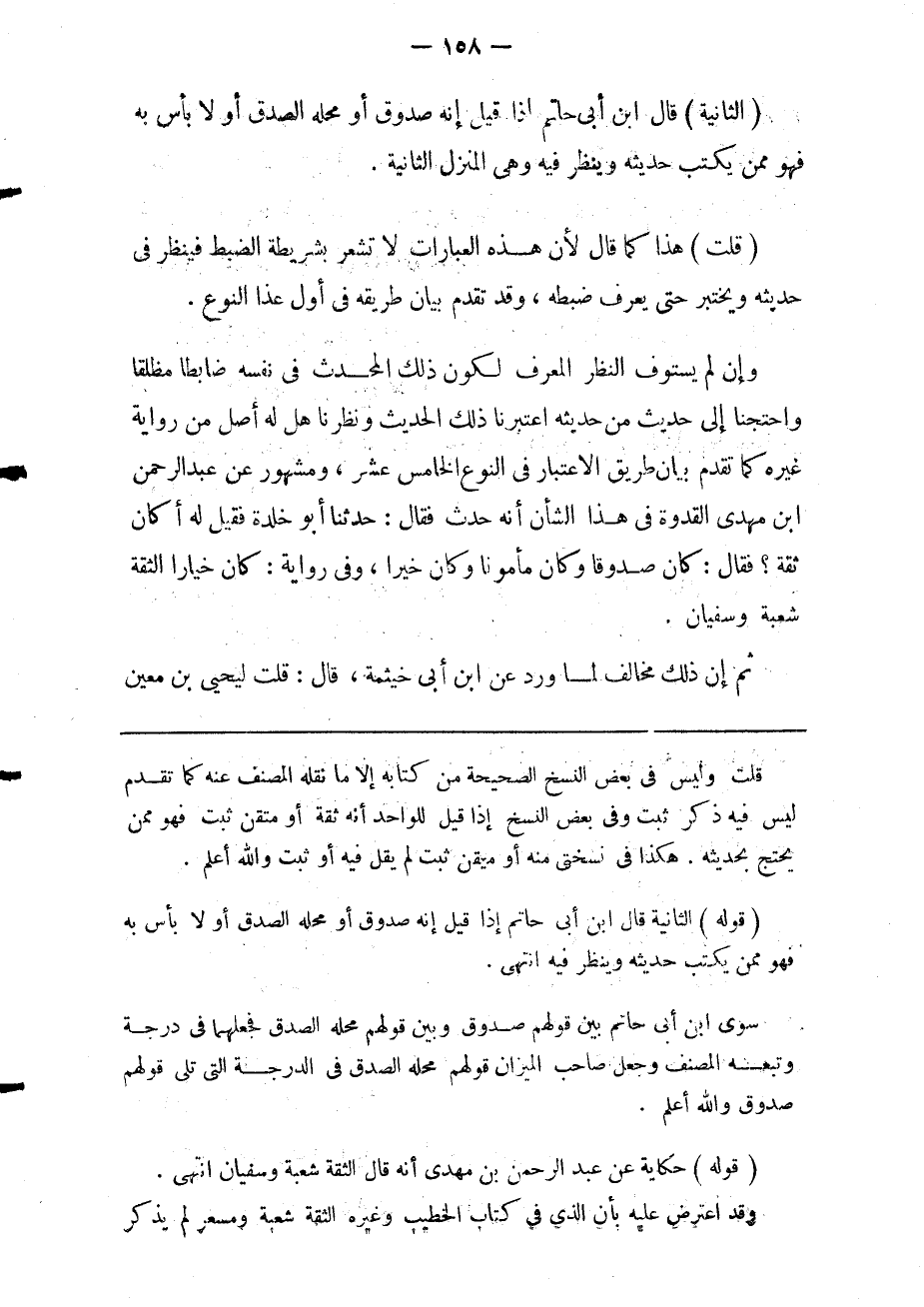 وإن لم يستوف النظر المعرف لكون ذلك المحدث في نفسه ضابطا مطلقا واحتجنا إلى حديث من حديثه اعتبرنا ذلك الحديث ونظرنا: هل له أصل من رواية غيره؟ كما تقدم بيان طريق إلاعتبار في النوع الخامس عشر ومشهور عن عبد الرحمن بن مهدي القدوة في هذا الشأن أنه حدث فقال: حدثنا أبو خلدة فقيل له: أكان ثقة؟ فقال: كان صدوقا وكان مأمونا وكان خيرا وفي رواية: وكان خيارا الثقة شعبة وسفيان.
