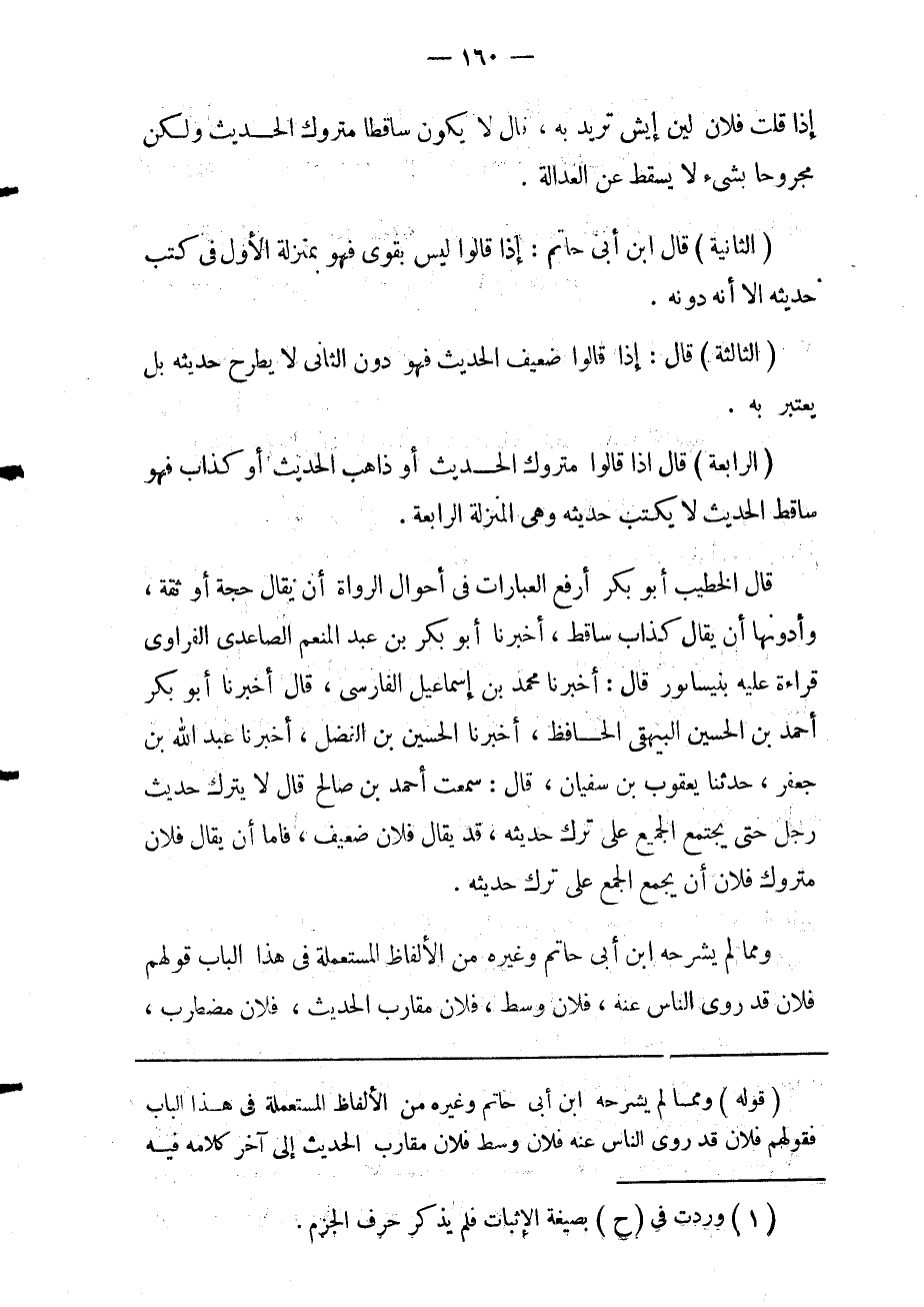 73 قال الخطيب أبو بكر: أرفع العبارات في أحوال الرواة أن يقال حجة أو: ثقة. وأدونها أن يقال كذاب ساقط. أخبرنا أبو بكر بن عبد المنعم الصاعدي الفراوي قراءة عليه بنيسابور قال: أخبرنا محمد بن إسماعيل الفارسي قال: أخبرنا أبو بكر أحمد بن الحسين البيهقي الحافظ: أخبرنا الحسين بن الفضل: أخبرنا عبد الله بن جعفر: حد ثنا يعقوب بن سفيان قال: سمعت أحمد بن صالح قال: لا يترك حديث رجل حتى يجتمع الجميع على ترك حديثه. قد يقال: فلان ضعيف فأما أن يقال: فلان متروك فلا إلا أن يجمع الجميع على ترك حديثه.