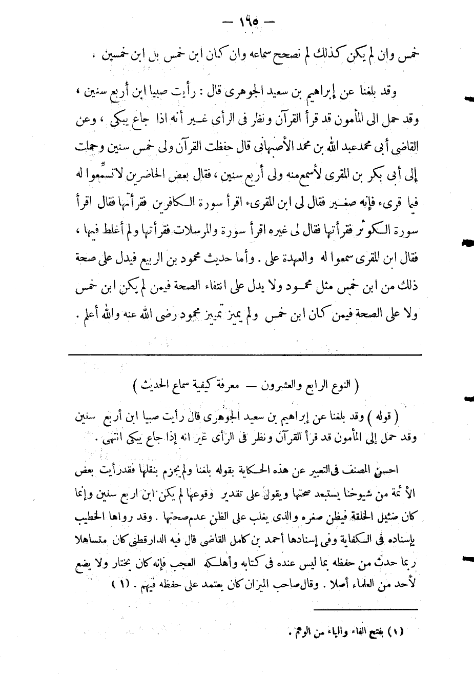 وقد بلغنا عن إبراهيم بن سعيد الجوهري قال: رأيت صبيا ابن أربع سنين قد حمل إلى المأمون قد قرأ القرآن ونظر في الرأي غير أنه إذا جاع يبكي وعن القاضي أبي محمد عبد الله بن محمد إلاصبهاني قال: حفظت القرآن ولي خمس سنين. وحملت إلى أبي بكر بن المقرئ لأسمع منه ولي أربع سنين. فقال بعض الحاضرين: لا تسمعوا له فيما قرئ فإنه صغير. فقال لي ابن المقرئ: اقرأ سورة الكافرين فقرأتها فقال: اقرأ سورة التكوير فقرأتها فقال لي غيره: اقرأ سورة المرسلات فقرأتها ولم أغلط فيها. فقال ابن المقرئ: سمعوا له والعهدة علي وأما حديث محمود بن الربيع: فيدل على صحة ذلك من ابن خمس مثل محمود ولا يدل على انتفاء الصحة فيمن لم يكن ابن خمس ولا على الصحة فيمن كان ابن خمس ولم يميز تمييز محمود رضي الله عنه والله أعلم.
