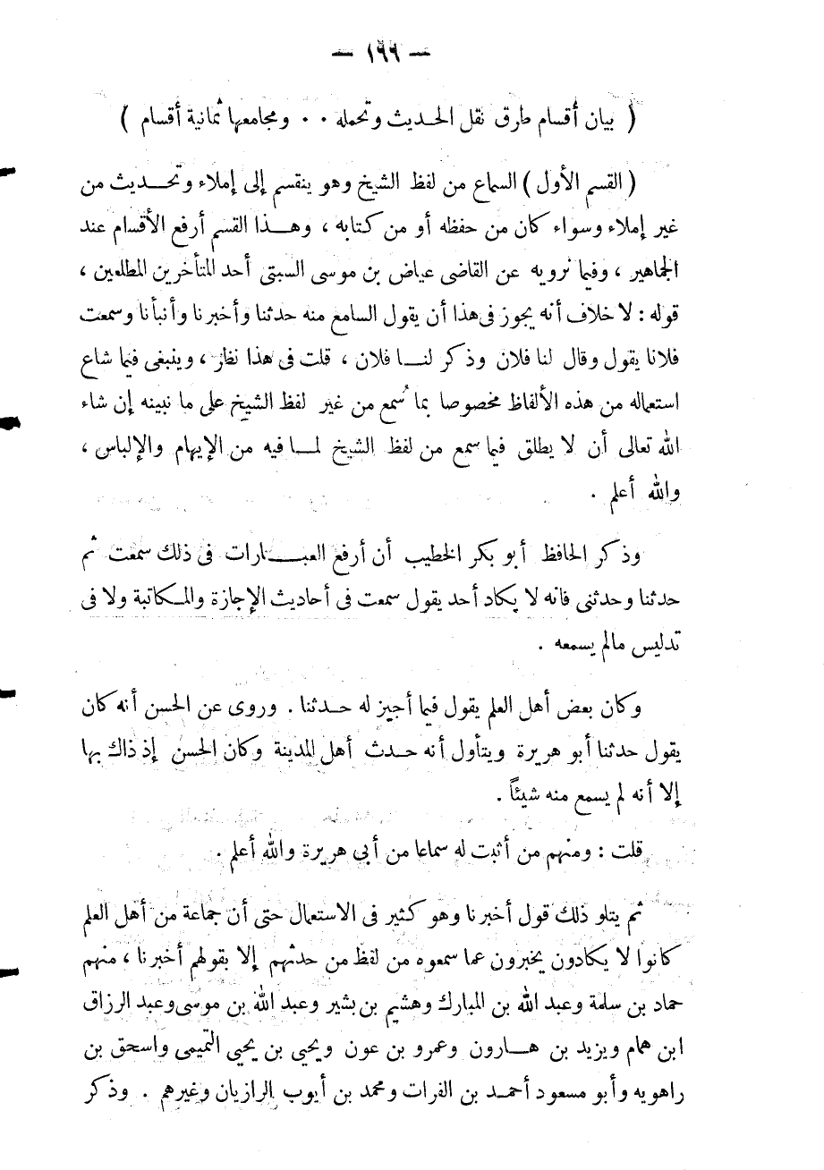 القسم الأول: السماع من لفظ الشيخ: وهو ينقسم إلى إملاء وتحديث من غير إملاء وسواء كان من حفظه أو من كتابه وهذا القسم أرفع الأقسام عند الجماهير. وفيما نرويه عن القاضي عياض بن موسى السبتي أحد المتأخرين المطلعين قوله: لا خلاف أنه يجوز في هذا أن يقول السامع منه حدثنا وأخبرنا وأنبأنا وسمعت فلانا يقول وقال لنا فلان وذكر لنا فلان قلت: في هذا نظر وينبغي فيما شاع استعماله من هذه الألفاظ مخصوصا بما سمع من غير لفظ الشيخ على ما نبينه إن شاء الله تعالى أن لا يطلق فيما سمع من لفظ الشيخ لما فيه من الإيهام والإلباس والله أعلم.