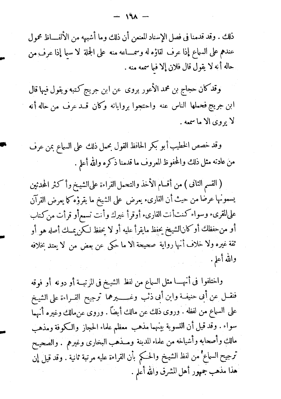 والصحيح: ترجيح السماع من لفظ الشيخ والحكم بأن القراءة عليه مرتبة ثانية. وقد قيل: إن هذا مذهب جمهور أهل المشرق والله أعلم.