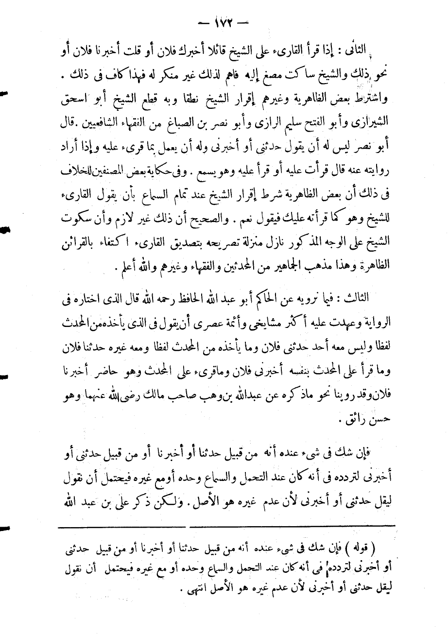 "قوله" فإن شك في شئ عنده أنه من قبيل حدثنا أو أخبرنا أو من قبيل حدثنى أو أخبرنى لتردده في أنه كان عند التحمل والسماع وحده أو مع غيره فيحتمل أن نقول ليقل حدثنى أو أخبرنى لأن عدم غيره هو الأصل انتهى.