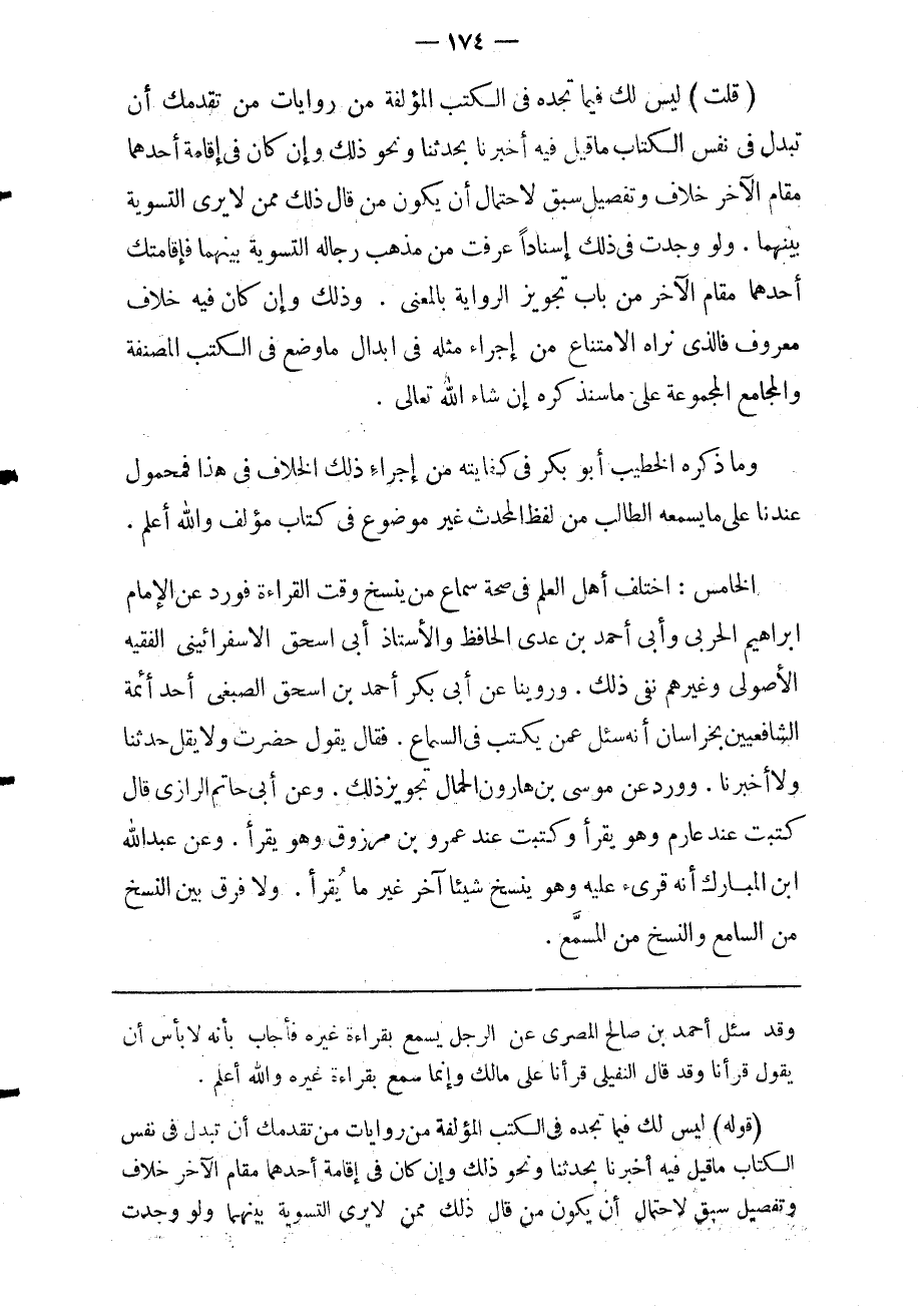 قلت: ليس لك فيما تجده في الكتب المؤلفة من روايات من تقدمك أن تبدل في نفس الكتاب ما قيل فيه: أخبرنا ب حدثنا ونحو ذلك وإن كان في إقامة أحدهما مقام إلاخر خلاف وتفصيل سبق لاحتمال أن يكون من قال ذلك ممن لا يرى التسوية بينهما. ولو وجدت من ذلك إسنادا عرفت من مذهب رجاله التسوية بينهما فإقامتك أحدهما مقام إلاخر من باب تجويز الرواية بالمعنى. وذلك وإن كان فيه خلاف معروف فالذي نراه إلامتناع من إجراء مثله في إبدال ما وضع في الكتب المصنفة والمجامع المجموعة على ما سنذكره إن شاء الله تعالى.