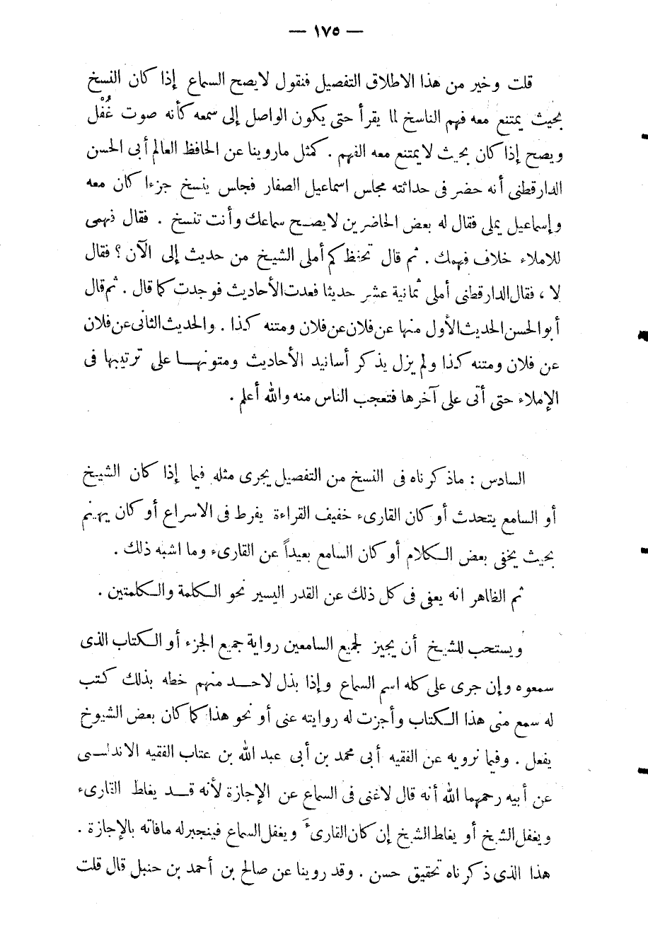 قلت: وخير من هذا الإطلاق التفصيل. فنقول لا يصح السماع إذا كان النسخ بحيث يمتنع معه فهم الناسخ لما يقرأ حتى يكون الواصل إلى سمعه كأنه صوت غفل ويصح إذا كان بحيث لا يمتنع معه الفهم. كمثل ما رويناه عن الحافظ العالم أبي الحسن الدارقطني: أنه حضر في حداثته مجلس إسماعيل الصفار فجلس بنسخ جزءا كان معه وإسماعيل يملي فقال له بعض الحاضرين: لا يصح سماعك وأنت تنسخ. فقال: فهمي للإملاء خلاف فهمك. ثم قال: تحفظ كم أملى الشيخ من حديث إلى الآن؟ فقال: لا. فقال الدارقطني: أملى ثمانية عشر حديثا فعدت الأحاديث فوجدت كما قال. ثم قال أبو الحسن: الحديث الأول منها عن فلان عن فلان ومتنه كذا. والحديث الثاني عن فلان عن فلان ومتنه كذا. ولم يزل يذكر أسانيد الأحاديث ومتونها على ترتيبها في الإملاء حتى أتى على آخرها فتعجب الناس منه والله أعلم.