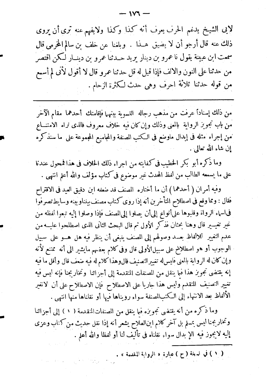 وفيه أمران أحدهما أن ما أختاره المصنف قد ضعفه ابن دقيق العيد في الاقتراح فقال ومما وقع في اصطلاح المتأخرين أنه إذا روى كتاب مصنف بيننا وبينه وسايط تصرفوا في اسماء الرواة وقلبوها على أنواع إلى أن يصلوا إلى المصنف فإذا وصلوا إليه تبعوا لفظه من غير تغيير قال وهنا بحثان فذكر الأول ثم قال البحث الثانى الذى اصطلحوا عليه من عدم التغيير للالفاظ بعد وصولهم إلى المصنف ينبغى أن ينظر فيه هل هو على سبيل الوجوب أو هو اصطلاح على سبيل الأولى قال وفي كلام بعضهم ما يشير الى أنه ممتنع لأنه وإن كان له الرواية بالمعنى فليس له تغيير التصنيف قال وهذا كلام له فيه ضعف قال وأقل ما فيه إنه يقتضى تجويز هذا فيما ينقل من المصنفات المتقدمة إلى أجزائنا وتخاريجنا فإنه ليس فيه تغيير التصنيف المتقدم وليس هذا جاريا على الاصطلاح فإن الاصطلاح على أن لا نغير الألفاظ بعد الانتهاء إلى الكتب المصنفة سواء رويناها فيها أو نقلناها منها انتهى.