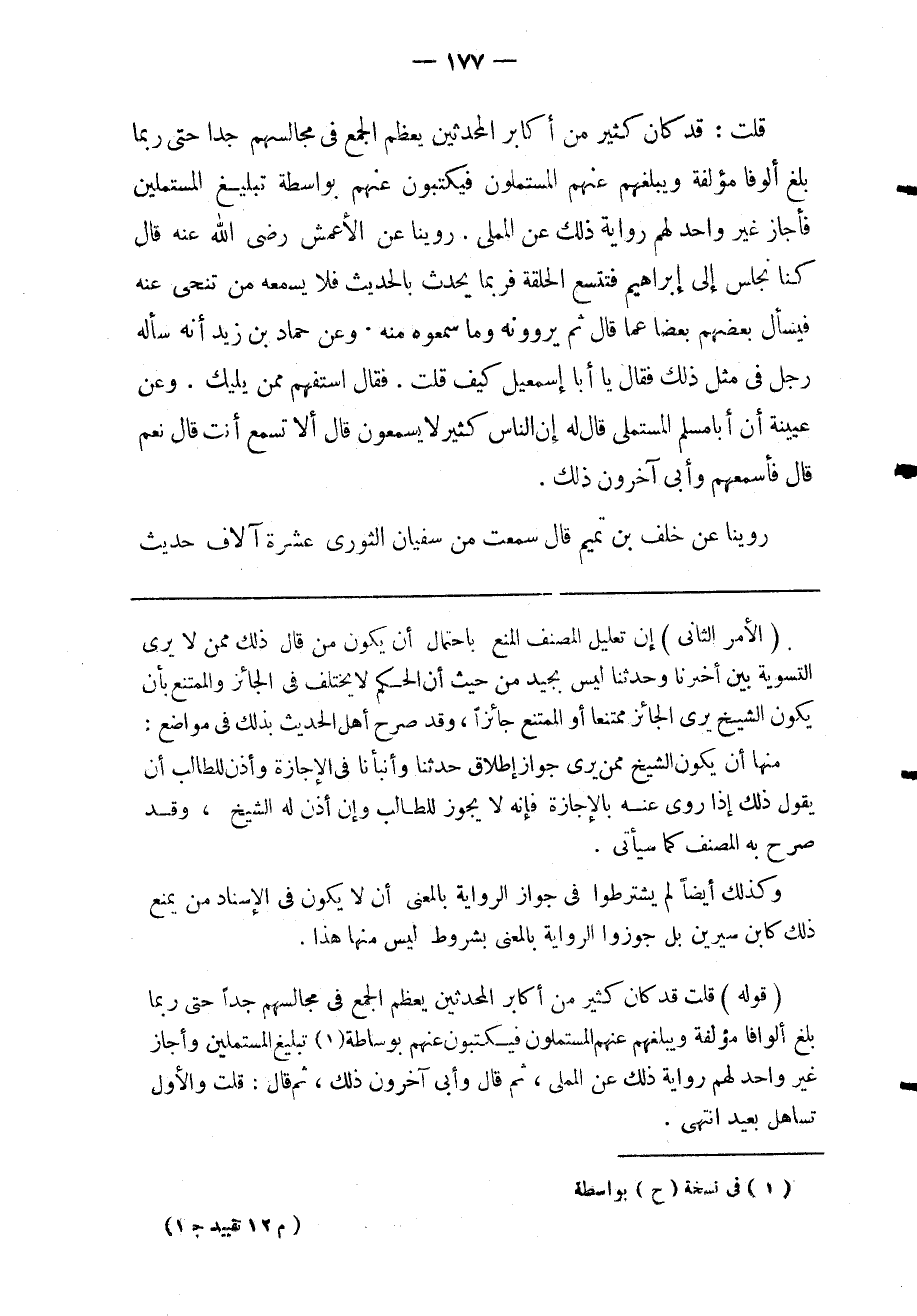 قوله قلت قد كان كثير من أكابر المحدثين يعظم الجمع في مجالسهم جدا حتى ربما بلغ ألوافا مؤلفة ويبلغهم عنهم المستملون فيكتبون عنهم بوساطة تبليغ المستملين وأجاز غير واحد لهم رواية ذلك عن المملى ثم قال وأبى آخرون ذلك ثم قال قلت والأول تساهل بعيد انتهى.