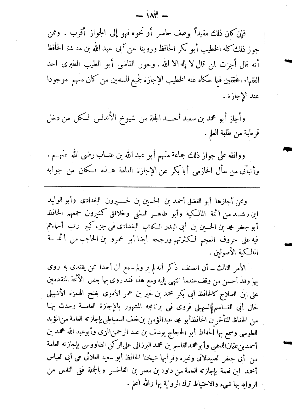 فإن كان ذلك مقيدا بوصف حاصر أو نحوه فهو إلى الجواز أقرب. وممن جوز ذلك كله الخطيب أبو بكر الحافظ. وروينا عن أبي عبد الله بن منده الحافظ أنه قال: أجزت لمن قال لا إله إلا الله. وجوز القاضي أبو الطيب الطبري أحد الفقهاء المحققين فيما حكاه عنه الخطيب الإجازة لجميع المسلمين من كان منهم موجودا عند الإجازة.