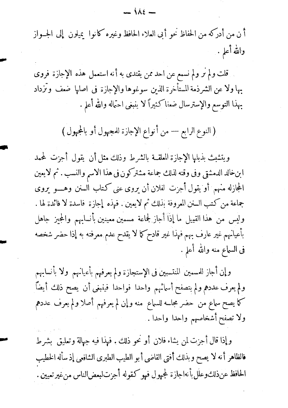 ويتشبث بذيلها الإجازة المعلقة بالشرط. وذلك مثل أن يقول أجزت لمحمد بن خالد الدمشقي. وفي وقته ذلك جماعة مشتركون في هذا إلاسم والنسب ثم لا يعين المجاز له منهم. أو يقول أجزت لفلان أن يروي عني كتاب السنن وهو يروي جماعة من كتب السنن المعروفة بذلك ثم لا يعين فهذه إجازة فاسدة لا فائدة لها وليس من هذا القبيل ما إذا أجاز لجماعة مسمين معينين بأنسابهم والمجيز جاهل بأعيانهم غير عارف بهم فهذا غير قادح كما لا يقدح عدم معرفته به إذا حضر شخصه في السماع منه والله أعلم.