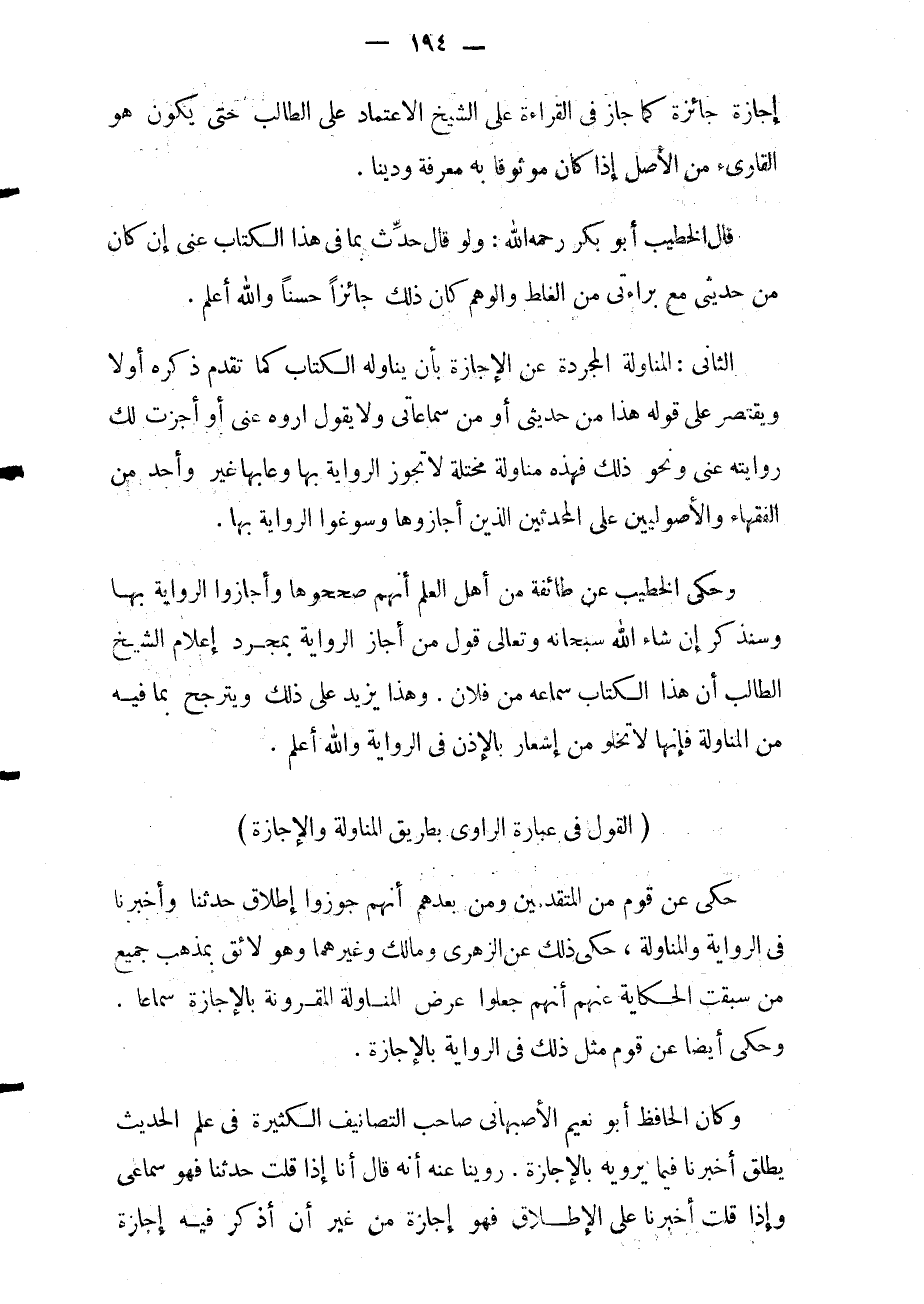 وحكى الخطيب عن طائفة من أهل العلم: أنهم صححوها وأجازوا الرواية بها وسنذكر إن شاء الله سبحانه وتعالى قول من أجاز الرواية بمجرد إعلام الشيخ الطالب: أن هذا الكتاب سماعه من فلان. وهذا يزيد على ذلك ويترجح بما فيه من المناولة فإنها لا تخلو من إشعار بالإذن في الرواية والله أعلم.
