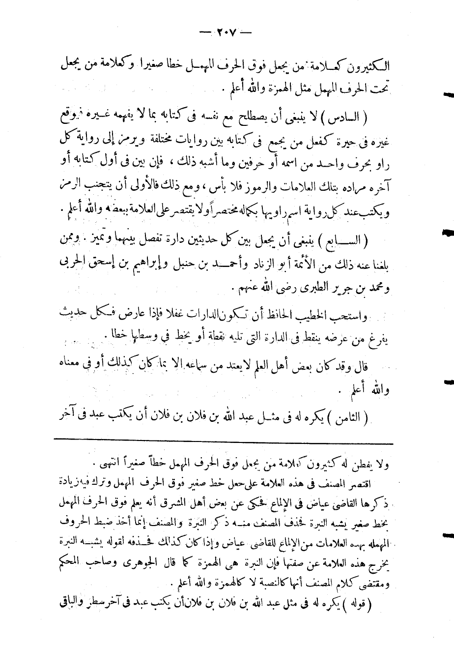 السادس: لا ينبغي أن يصطلح مع نفسه في كتابه بما لا يفهمه غيره فيوقع غيره في حيرة كفعل من يجمع في كتابه بين روايات مختلفة ويرمز إلى رواية كل راو بحرف واحد من اسمه أو حرفين وما أشبه ذلك. فإن بين في أول كتابه أو آخره مراده بتلك العلامات والرموز فلا بأس. ومع ذلك فإلاولى أن يتجنب الرمز ويكتب عند كل رواية اسم راويها بكماله مختصرا ولا يقتصر على العلامة ببعضه والله أعلم.
