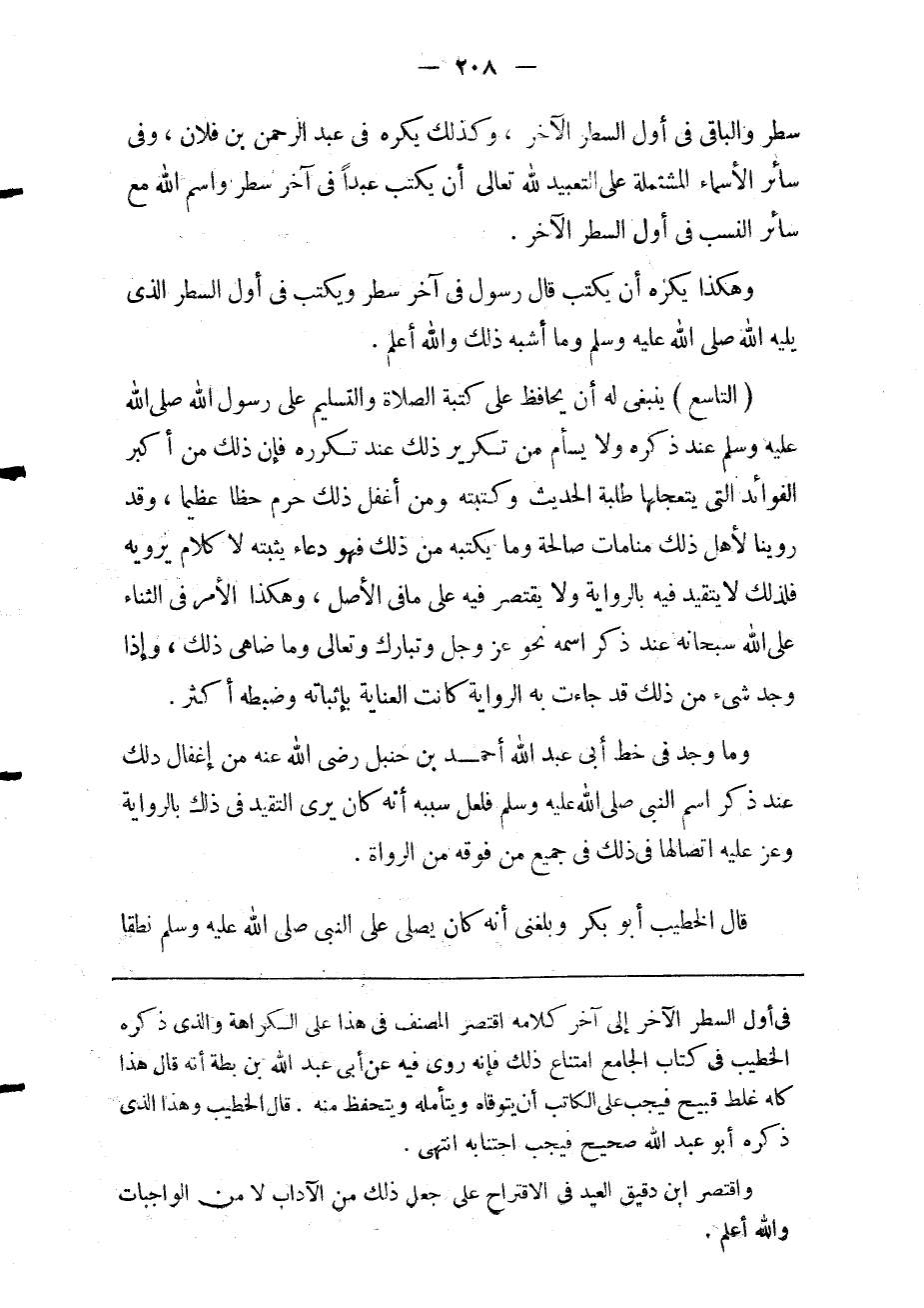 في أول السطر الآخر إلى آخر كلامه اقتصر المصنف في هذا على الكراهة والذى ذكره الخطيب في كتاب الجامع امتناع ذلك فإنه روى فيه عن أبى عبد الله بن بطة أنه قال هذا كله غلط قبيح فيجب على الكاتب أن يتوقاه ويتأمله ويتحفظ منه قال الخطيب وهذا الذى ذكره أبو عبد الله صحيح فيجب اجتنابه انتهى.