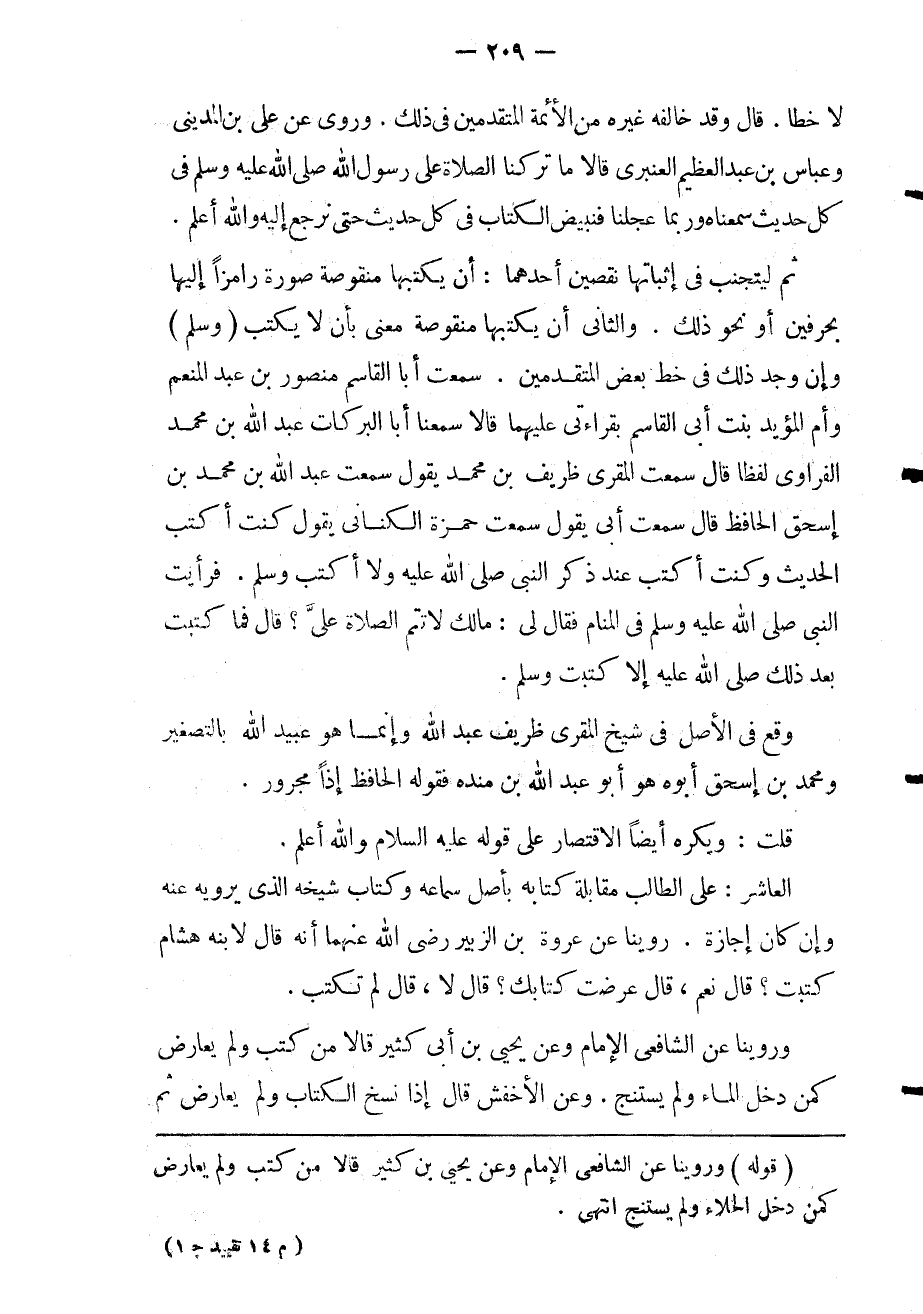 والثاني: أن يكتبها منقوصة معنى بأن لا يكتب وسلم وإن وجد ذلك في خط بعض المتقدمين. سمعت أبا القاسم منصور بن عبد المنعم وأم المؤيد بنت أبي القاسم بقرائتي عليهما قإلا: سمعنا أبا البركات عبد الله بن محمد الفراوي لفظا قال: سمعت المقرئ ظريف بن محمد يقول: سمعت عبد الله بن محمد بن إسحاق الحافظ قال: سمعت أبي يقول: سمعت حمزة الكناني يقول: كنت أكتب الحديث وكنت أكتب عند ذكر النبي صلى الله عليه ولا أكتب وسلم فرأيت النبي صلى الله عليه وآله وسلم في المنام فقال لي: ما لك لا تتم الصلاة علي؟ قال: فما كتبت بعد ذلك صلى الله عليه إلا كتبت وسلم.