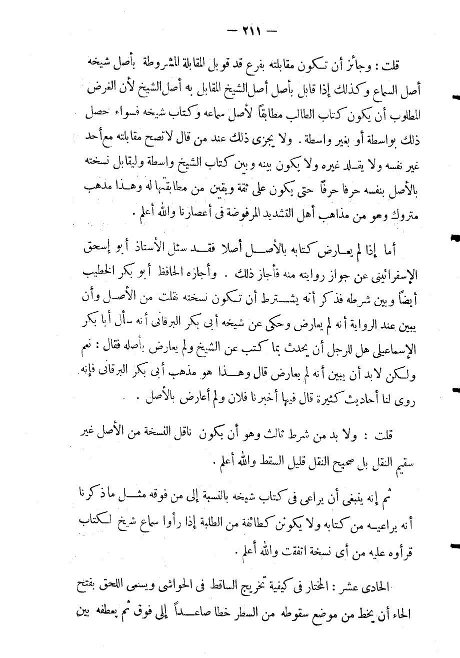 قلت: ولا بد من شرط ثالث وهو: أن يكون ناقل النسخة من الأصل غير سقيم النقل بل صحيح النقل قليل السقط والله أعلم.