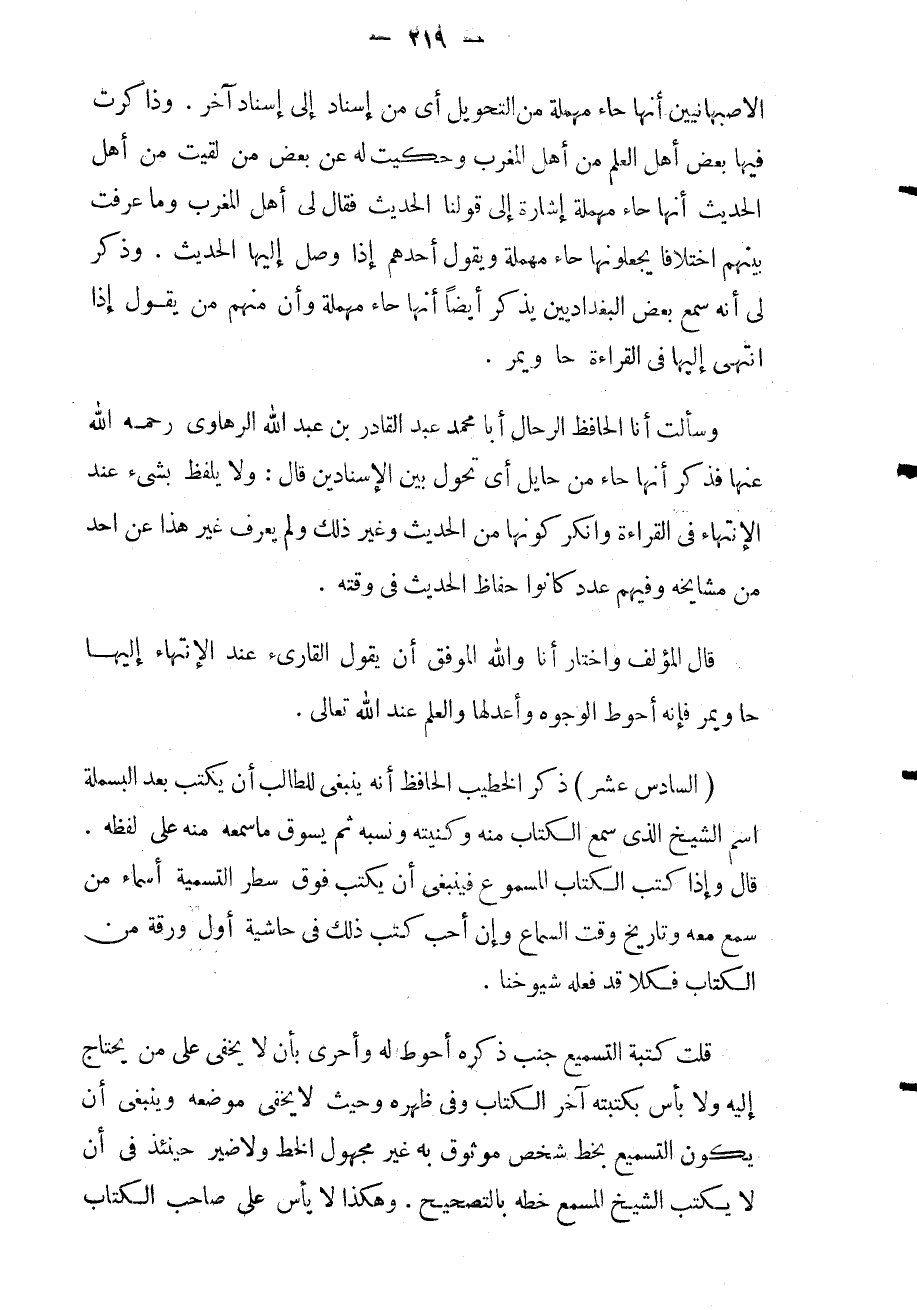 السادس عشر: ذكر الخطيب الحافظ: أنه ينبغي للطالب أن يكتب بعد البسملة اسم الشيخ الذي سمع الكتاب منه وكنيته ونسبه ثم يسوق ما سمعه منه على لفظه. قال: وإذا كتب الكتاب المسموع فينبغي أن يكتب فوق سطر التسمية أسماء من سمع معه وتاريخ وقت السماع وإن أحب كتب ذلك في حاشية أول ورقة من الكتاب فكلا قد فعله شيوخنا.