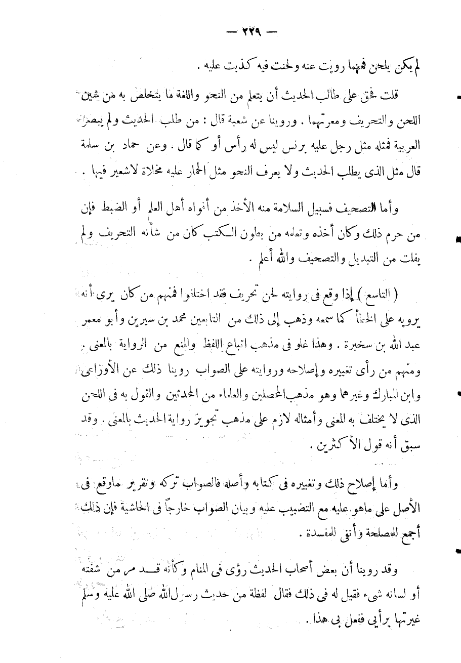 ومنهم من رأى تغييره وإصلاحه وروايته على الصواب. روينا ذلك عن الأوزاعي وابن المبارك وغيرهما وهو مذهب المحصلين والعلماء من المحدثين. والقول به في اللحن الذي لا يختلف به المعنى وأمثاله لازم على مذهب تجويز رواية الحديث بالمعنى وقد سبق أنه قول الأكثرين.