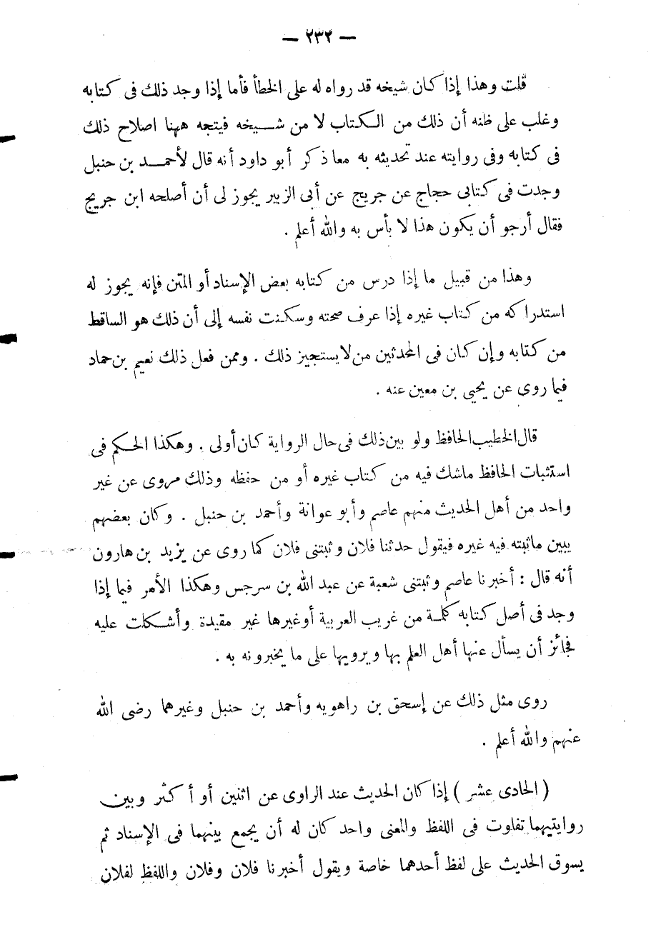 وهكذا إلامر فيما إذا وجد في أصل كتابه كلمة من غريب العربية أو غيرها غير مقيدة وأشكلت عليه فجائز أن يسأل عنها أهل العلم بها ويرويها على ما يخبرونه به.