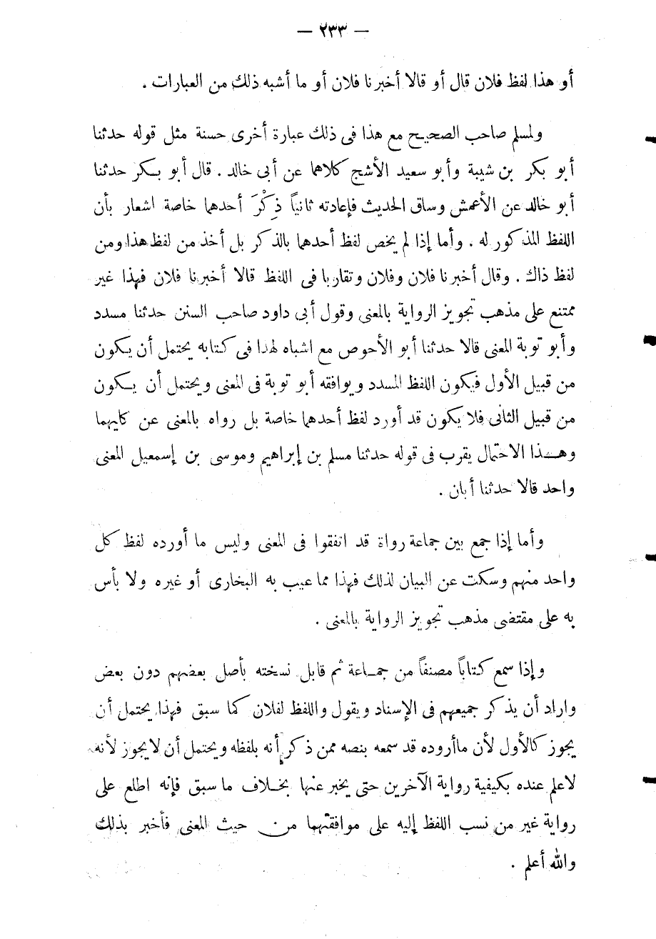 ولمسلم صاحب الصحيح مع هذا في ذلك عبارة أخرى حسنة مثل قوله: حدثنا أبو بكر بن أبي شيبة وأبو سعيد إلاشج كلاهما عن أبي خالد قال أبو بكر: حدثنا أبو خالد إلاحمر عن إلاعمش.. وساق الحديث. فإعادته ثانيا ذكر أحدهما خاصة إشعار بأن اللفظ المذكور له وأما إذا لم يخص لفظ أحدهما بالذكر بل أخذ من لفظ هذا ومن لفظ ذاك وقال أخبرنا فلان وفلان وتقاربا في اللفظ قإلا: أخبرنا فلان فهذا غير ممتنع على مذهب تجويز الرواية بالمعنى وقول أبي داو د صاحب السنن حدثنا مسدد وأبو توبة المعنى قإلا: حدثنا أبو إلاحوص مع أشباه لهذا في كتابه يحتمل أن يكون من قبيل إلاول فيكون اللفظ لمسدد ويوافقه أبو توبة في المعنى. ويحتمل أن يكون من قبيل الثاني فلا يكون قد أورد لفظ أحدهما خاصة بل رواه بالمعنى عن كليهما وهذا إلاحتمال يقرب في قوله حدثنا مسلم بن إبراهيم وموسى بن إسماعيل المعنى واحد قإلا: حدثنا أبان.