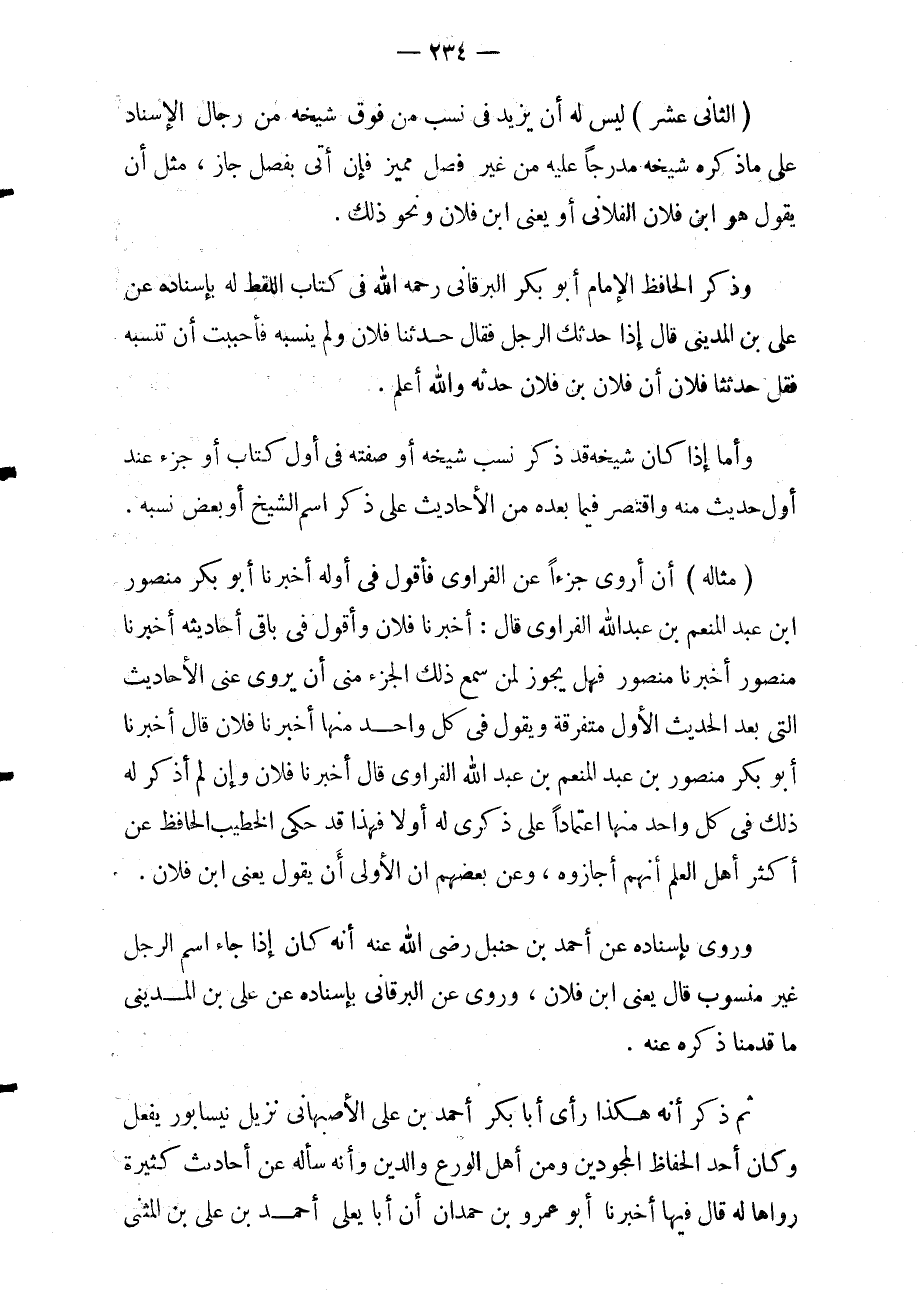 وذكر الحافظ إلامام أبو بكر البرقاني رحمه الله في كتاب اللقط له بإسناده عن علي بن المديني قال: إذا حدثك الرجل فقال: حدثنا فلان ولم ينسبه فأحببت أن تنسبه فقل حدثنا فلان: أن فلان بن فلان حدثه والله أعلم.