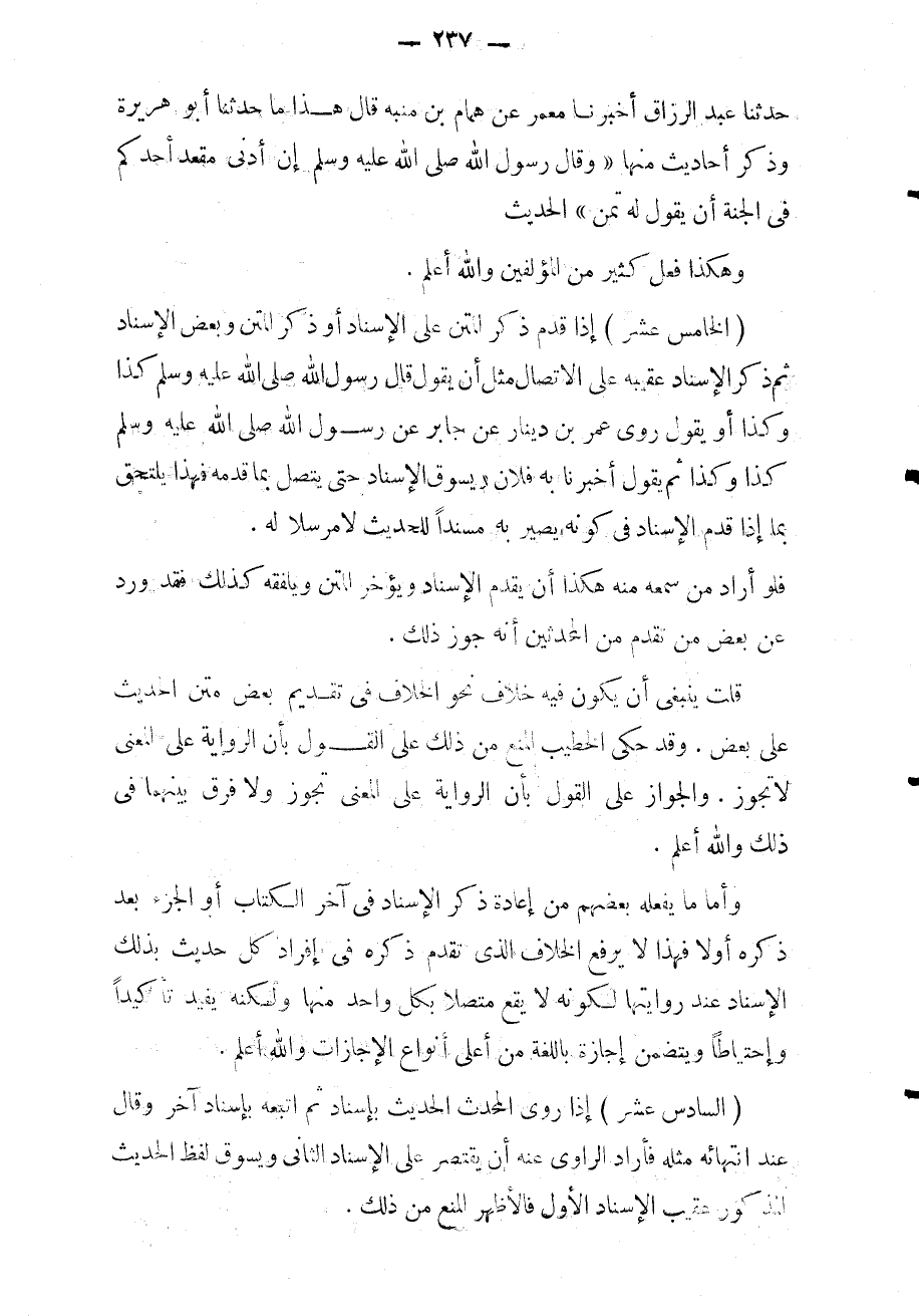 الخامس عشر: إذا قدم ذكر المتن على الإسناد أو ذكر المتن وبعض الإسناد ثم ذكر الإسناد عقيبه على إلاتصال. مثل أن يقول قال رسول الله صلى الله عليه وسلم كذا وكذا أو يقول روى عمرو بن دينار عن جابر عن رسول الله صلى الله عليه وسلم كذا وكذا ثم يقول أخبرنا به فلان قال: أخبرنا فلان ويسوق الإسناد حتى يتصل بما قدمه فهذا يلتحق بما إذا قدم الإسناد في كونه يصير به مسندا للحديث لا مرسلا له.