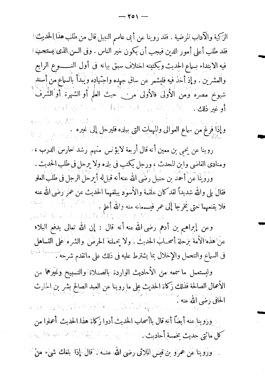 وعن إبراهيم بن أدهم رضي الله عنه أنه قال: إن الله تعالى يدفع البلاء عن هذه الأمة برحلة أصحاب الحديث ولا يحملنه الحرص والشره على التساهل في السماع والتحمل والإخلال بما يشترط عليه في ذلك على ما تقدم شرحه.