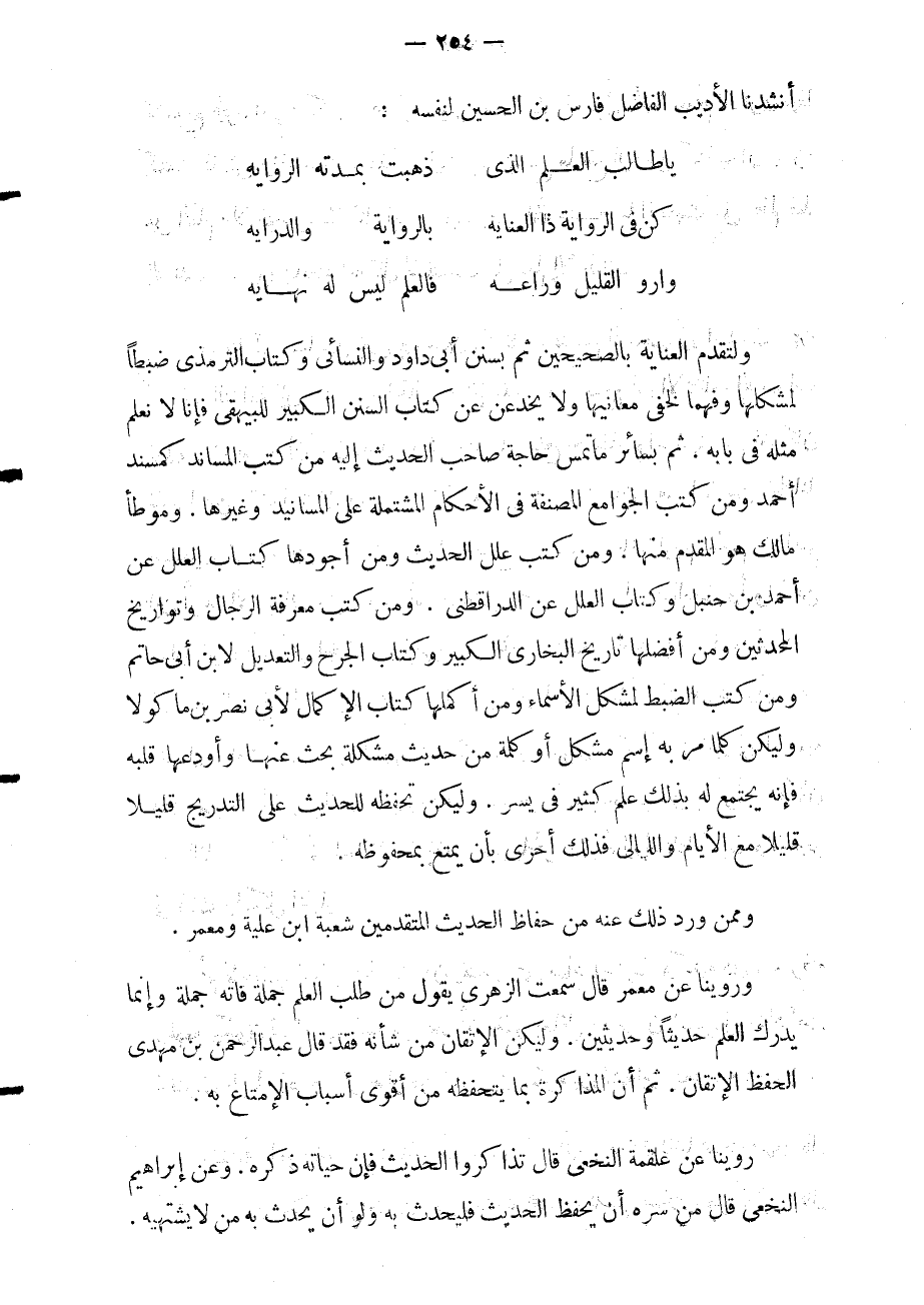 ولتقدم العناية بالصحيحين ثم بسنن أبي داود وسنن النسائي وكتاب الترمذي ضبطا لمشكلها وفهما لخفي معانيها ولا يخدعن عن كتاب السنن الكبير للبيهقي فإنا لا نعلم مثله في بابه ثم بسائر ما تمس حاجة صاحب الحديث إليه من كتب المساند كمسند أحمد ومن كتب الجوامع المصنفة في إلاحكام المشتملة على المسانيد وغيرها وموطأ مالك هو المقدم منها ومن كتب علل الحديث ومن أجودها كتاب العلل عن أحمد بن حنبل وكتاب العلل عن الدارقطني ومن كتب معرفة الرجال وتواريخ المحدثين ومن أفضلها تاريخ البخاري الكبير وكتاب الجرح والتعديل لابن أبي حاتم ومن كتب الضبط لمشكل إلاسماء ومن أكملها كتاب إلاكمال لأبي ناصر بن ماكولا وليكن كلما مر به اسم مشكل أو كلمة من حديث مشكلة بحث عنها وأودعها قلبه فإنه يجتمع له بذلك علم كثير في يسر