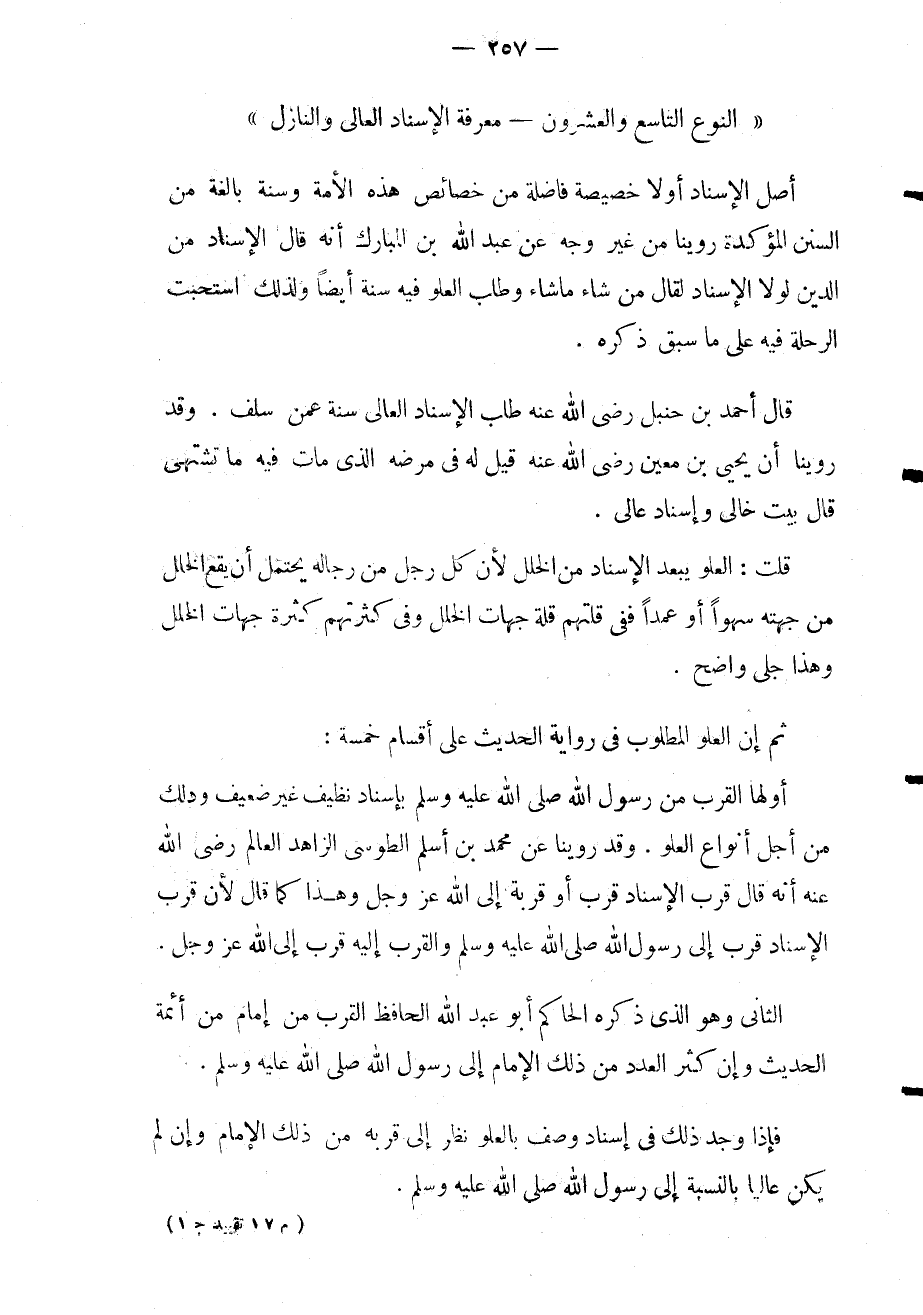 أولها: القرب من رسول الله صلى الله عليه وسلم بإسناد نظيف غير ضعيف وذلك من أجل أنواع العلو. وقد روينا عن محمد بن أسلم الطوسي الزاهد العالم رضي الله عنه أنه قال: قرب الإسناد قرب أو قربة إلى الله عز وجل. وهذا كما قال لأن قرب الإسناد قرب إلى رسول الله صلى الله عليه وسلم والقرب إليه قرب إلى الله عز وجل.