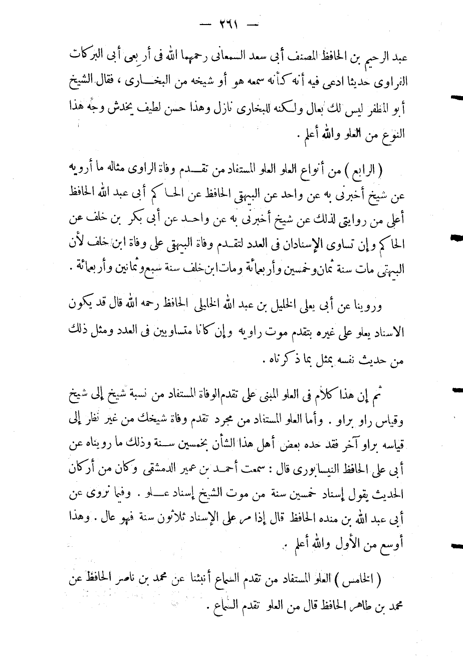 الرابع: من أنواع العلو: العلو المستفاد من تقدم وفاة الراوي مثاله ما أرويه عن شيخ أخبرني به عن واحد عن البيهقي الحافظ عن الحاكم أبي عبد الله الحافظ أعلى من روايتي لذلك عن شيخ أخبرني به عن واحد عن أبي بكر بن خلف عن الحاكم وإن تساوى الإسنادان في العدد لتقدم وفاة البيهقي على وفاة ابن خلف لأن البيهقي مات سنة ثمان وخمسين وأربعمائة ومات ابن خلف سنة سبع وثمانين وأربعمائة.