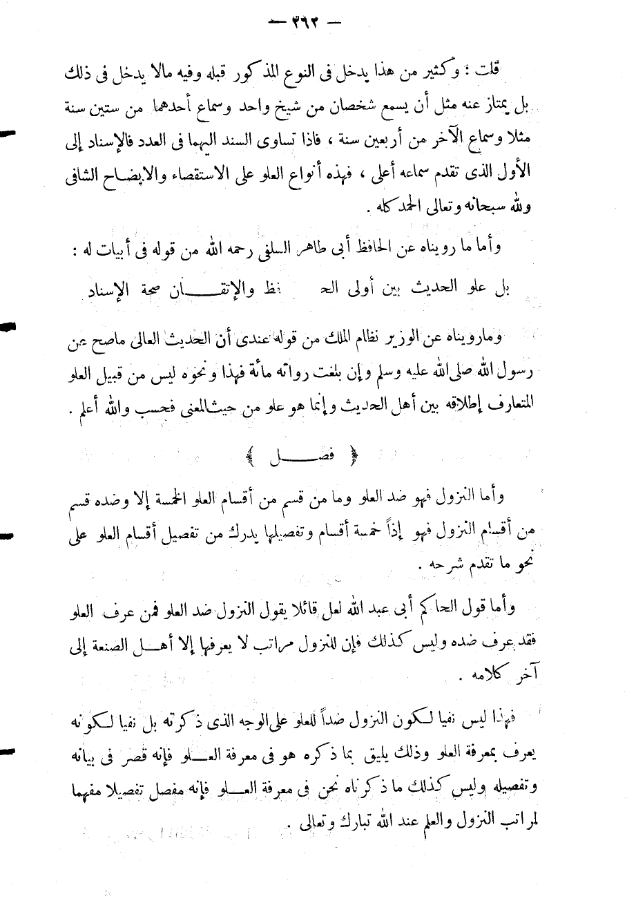 وأما قول الحاكم أبي عبد الله: لعل قائلا يقول النزول ضد العلو فمن عرف العلو فقد عرف ضده وليس كذلك فإن للنزول مراتب لا يعرفها إلا أهل الصنعة إلى آخر كلامه.