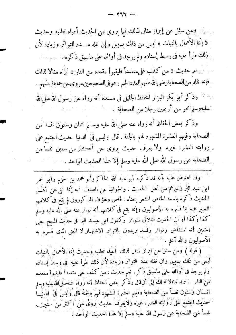 ومن سئل عن إبراز مثال لذلك فيما يروى من الحديث أعياه تطلبه وحديث: إنما الأعمال بالنيات ليس من ذلك بسبيل وإن نقله عدد التواتر وزيادة لأن ذلك طرأ عليه في وسط إسناده ولم يوجد في أوائله على ما سبق ذكره.
