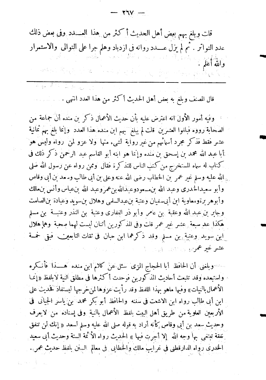 وفيه أمور: الأول: انه اعترض عليه بأن حديث الأعمال ذكر ابن منده أن جماعة من الصحابة رووه فبلغوا العشرين قلت لم يبلغ بهم ابن منده هذا العدد وإنما بلغ بهم ثمانية عشر فقط فذكر مجرد أسمائهم من غير رواية لشيء منها ولا عزو لمن رواه وليس هو أبا عبد الله محمد بن إسحق بن منده وإنما هو ابنه أبو القاسم عبد الرحمن ذكر ذلك في كتاب له سماه المستخرج من كتب الناس للتذكرة فقال وممن رواه عن رسول الله صلى الله عليه وسلم غير عمر بن الخطاب رضي الله عنه وعلى بن أبي طالب وسعد بن أبي وقاص وأبو سعيد الخدري وعبد الله بن مسعود وعبد الله بن عمر وعبد الله بن عباس وأنس بن مالك وأبو هريرة ومعاوية ابن أبي سفيان وعتبة بن عبد السلمي وهلال بن سويد وعبادة بن الصامت وجابر بن عبد الله وعقبة بن عامر وأبو ذر الغفاري وعتبة بن النذر وعتبة بن مسلم هكذا عد سبعة عشر غير عمر قلت وفي المذكورين أثنان ليست لهما صحبة وهما هلال ابن سويد وعتبة بن مسلم وقد ذكرهما ابن حبان في ثقات التابعين فبقى خمسة عشر غير عمر.