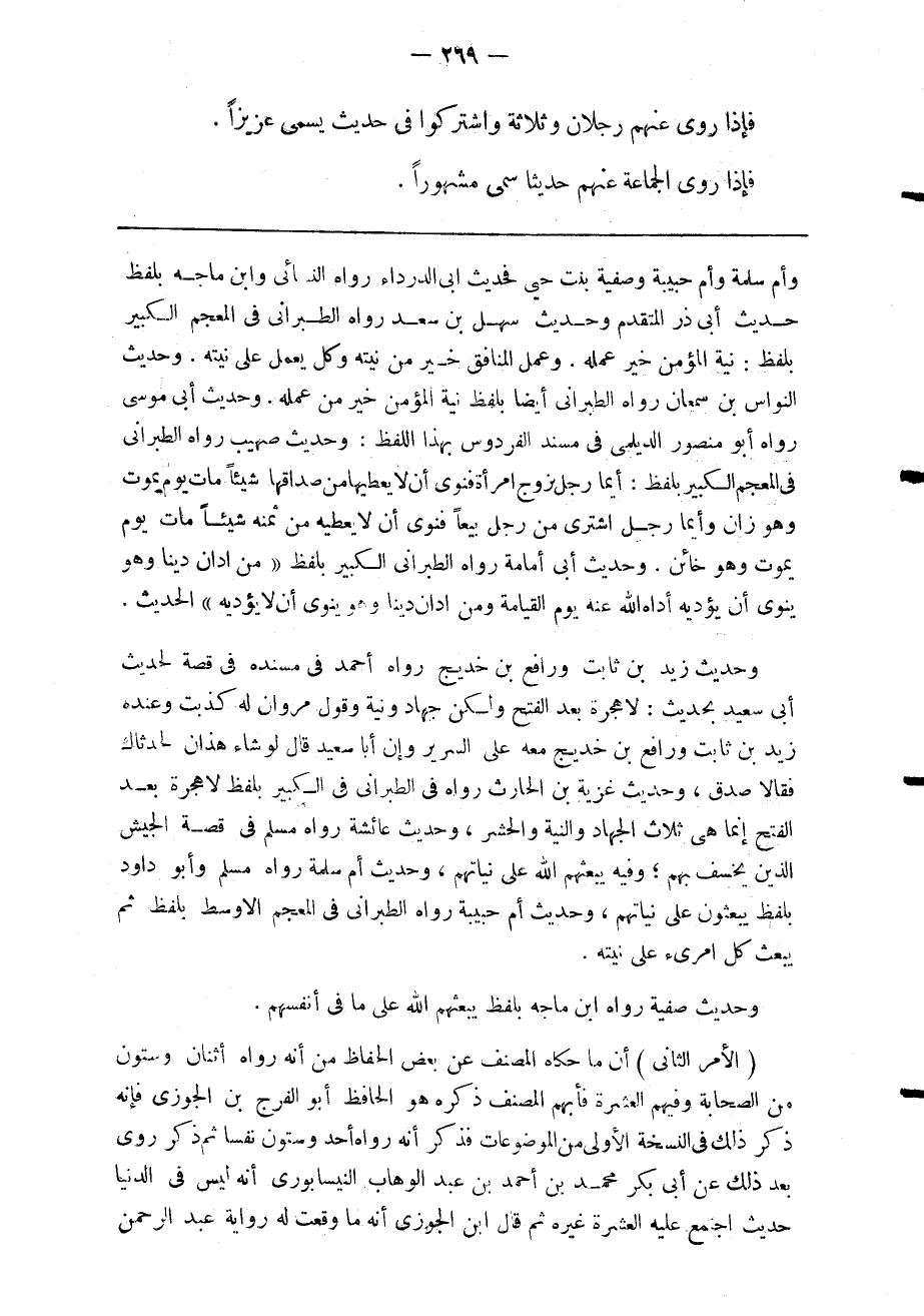 وحديث زيد بن ثابت ورافع بن خديج رواه أحمد في مسنده في قصة لحديث أبي سعيد بحديث " لا هجرة بعد الفتح ولكن جهاد ونية" وقول مروان له كذبت وعنده زيد بن ثابت ورافع بن خديج معه على السرير وإن أبا سعيد قال لو شاء هذان لحدثاك فقالا صدق وحديث غزية بن الحارث رواه في الطبراني في الكبير بلفظ "لا هجرة بعد الفتح إنما هى ثلاث الجهاد والنية والحشر" وحديث عائشة رواه مسلم في قصة الجيش الذين يخسف بهم وفيه "يبعثهم الله على نياتهم" وحديث أم سلمة رواه مسلم وأبو داود بلفظ "يبعثون على نياتهم" وحديث أم حبيبة رواه الطبراني في المعجم الأوسط بلفظ "ثم يبعث كل امرئ على نيته".