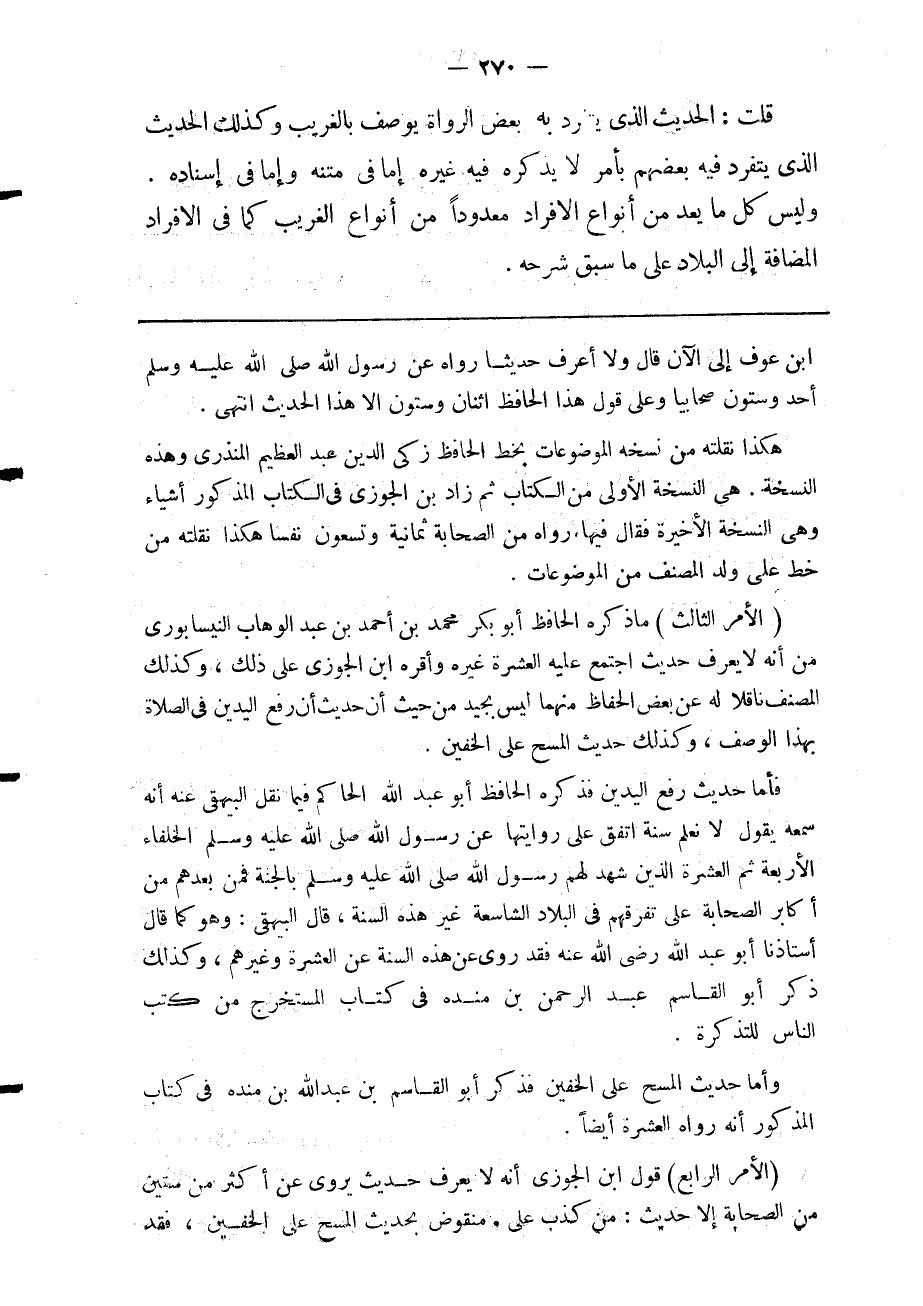 الأمر الثالث: ما ذكره الحافظ أبو بكر محمد بن أحمد بن عبد الوهاب النيسابوري من أنه لا يعرف حديث اجتمع عليه العشرة غيره وأقره ابن الجوزي على ذلك وكذلك المصنف ناقلا له عن بعض الحفاظ منهما ليس بجيد من حيث أن حديث أن رفع اليدين في الصلاة بهذا الوصف وكذلك حديث المسح على الخفين.