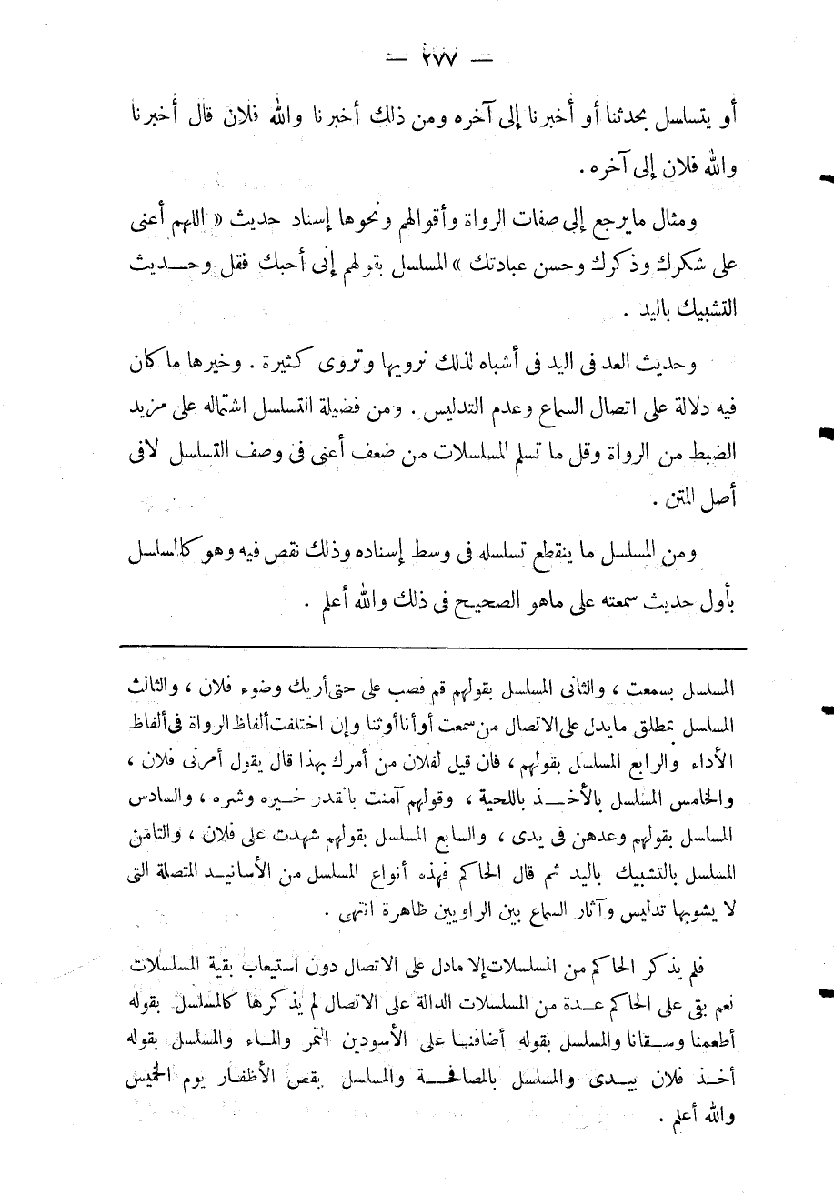 وحديث العد في اليد في أشباه لذلك نرويها وتروى كثيرة وخيرها ما كان فيه دلالة على اتصال السماع وعدم التدليس ومن فضيلة التسلسل اشتماله علي مزيد الضبط من الرواة وقلما تسلم المسلسلات من ضعف أعني في وصف التسلسل لا في أصل المتن.