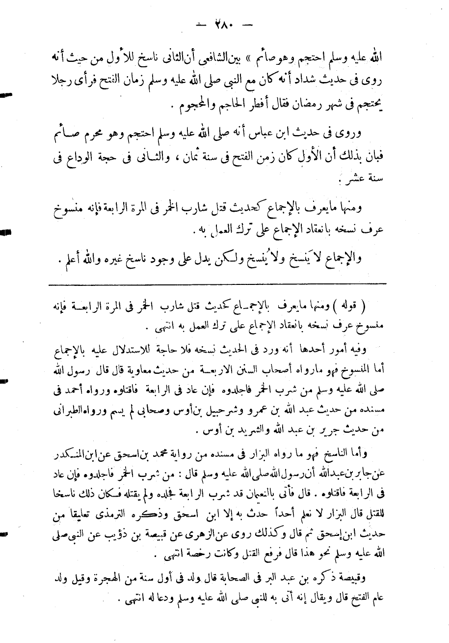 قوله ومنها ما يعرف بالإجماع كحديث قتل شارب الخمر في المرة الرابعة فإنه منسوخ عرف نسخه بانعقاد الاجماع على ترك العمل به انتهى.