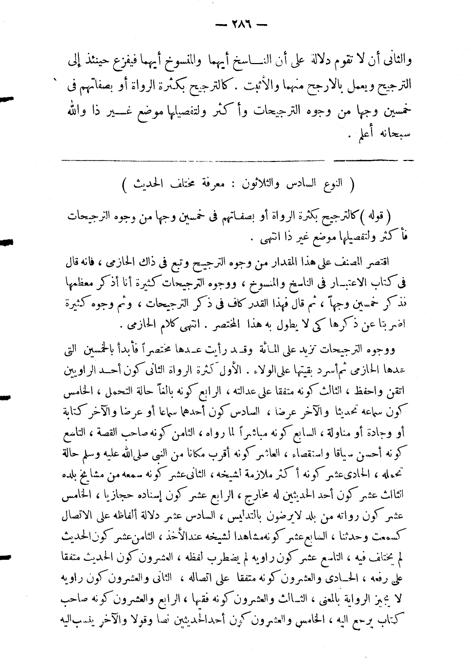 ووجوه الترجيحات تزيد على المائة وقد رأيت عدها مختصرا فأبدأ بالخمسين التي عدها الحازمى ثم أسرد بقيتها على الولاء الأول كثرة الرواة الثاني كون أحد الراويين اتقن واحفظ الثالث كونه متفقا على عدالته الرابع كونه بالغا حالة التحمل الخامس كون سماعه تحديثا والآخر عرضا السادس كون أحدهما سماعا أو عرضا والآخر كتابة أو وجادة أو مناولة السابع كونه مباشرا لما رواه الثامن كونه صاحب القصة التاسع كونه أحسن سياقا واستقصاء العاشر كونه أقرب مكانا من النبي صلى الله عليه وسلم حالة تحمله الحادى عشر كونه أكثر ملازمة لشيخه الثاني عشر كونه سمعه من مشايخ بلده الثالث عشر كون أحد الحديثين له مخارج الرابع عشر كون إسناده حجازيا الخامس عشر كون رواته من بلد لا يرضون بالتدليس السادس عشر دلالة ألفاظه على الاتصال كسمعت وحدثنا السابع عشر كونه مشاهدا لشيخه عند الأخذ الثامن عشر كون الحديث لم يختلف فيه التاسع عشر كون راويه لم يضطرب لفظه العشرون كون الحديث متفقا على رفعه الحادى والعشرون كونه متفقا على اتصاله الثاني والعشرون كون راويه لا يجيز الرواية بالمعنى الثالث والعشرون كونه فقيها الرابع والعشرون كونه صاحب كتاب يرجع اليه الخامس والعشرون كون أحد الحديثين نصا وقولا والآخر ينسب اليه