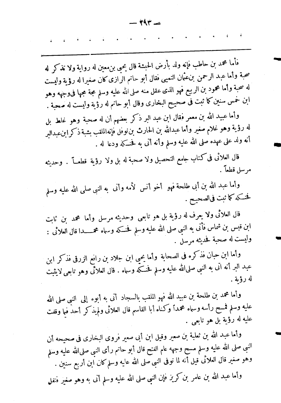فأما محمد بن حاطب فإنه ولد بأرض الحبشة قال يحيى بن معين له رواية ولا تذكر له صحبة وأما عبد الرحمن بن عثمان التميى فقال أبو حاتم الرازى كان صغيرا له رؤية وليست له صحبة وأما محمود بن الربيع فهو الذي عقل منه صلى الله عليه وسلم مجة مجها في وجهه وهو ابن خمس سنين كما ثبت في صحيح البخاري وقال أبو حاتم له رؤية وليست له صحبة.