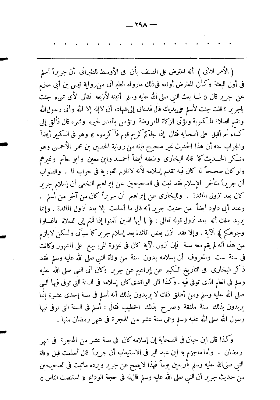 الأمر الثاني أنه اعترض على المصنف بأن في الأوسط للطبراني أن جريرا أسلم في أول البعثة وكأن المعترض أوقعه في ذلك ما رواه الطبراني من رواية قيس بن أبي حازم عن جرير قال لما بعث النبي صلى الله عليه وسلم أتيته لأبايعه فقال لأي شيء جئت يا جرير قلت جئت لأسلم على يديك قال فدعاني إلى شهادة أن لا إله إلا الله وأنى رسول الله وتقيم الصلاة المكتوبة وتؤتى الزكاة المفروضة وتؤمن بالقدر خيره وشره قال فألقى إلى كساء ثم أقبل على أصحابه فقال إذا جاءكم كريم قوم فأكرموه وهو في الكبير أيضا والجواب عنه أن هذا الحديث غير صحيح فإنه من رواية الحصين بن عمر الأحمسي وهو منكر الحديث كما قاله البخاري وضعفه أيضا أحمد وابن معين وأبو حاتم وغيرهم ولو كان صحيحا لما كان فيه تقدم إسلامه لأنه لا تلزم الفورية في جواب لما والصواب أن جريرا متأخر الإسلام فقد ثبت في الصحيحين عن إبراهيم النخعي أن إسلام جرير كان بعد نزول المائدة وللبخاري عن إبراهيم أن جريرا كان من آخر من أسلم.