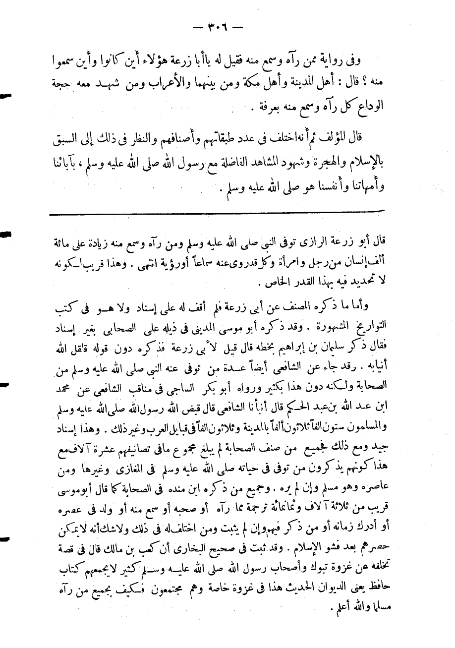 وفي رواية: ممن رآه وسمع منه. فقيل له: يا أبا زرعة هؤلاء أبن كانوا وأين سمعوا منه؟ قال: أهل المدينة وأهل مكة ومن بينهما والإعراب ومن شهد معه حجة الوداع كل رآه وسمع منه بعرفة.