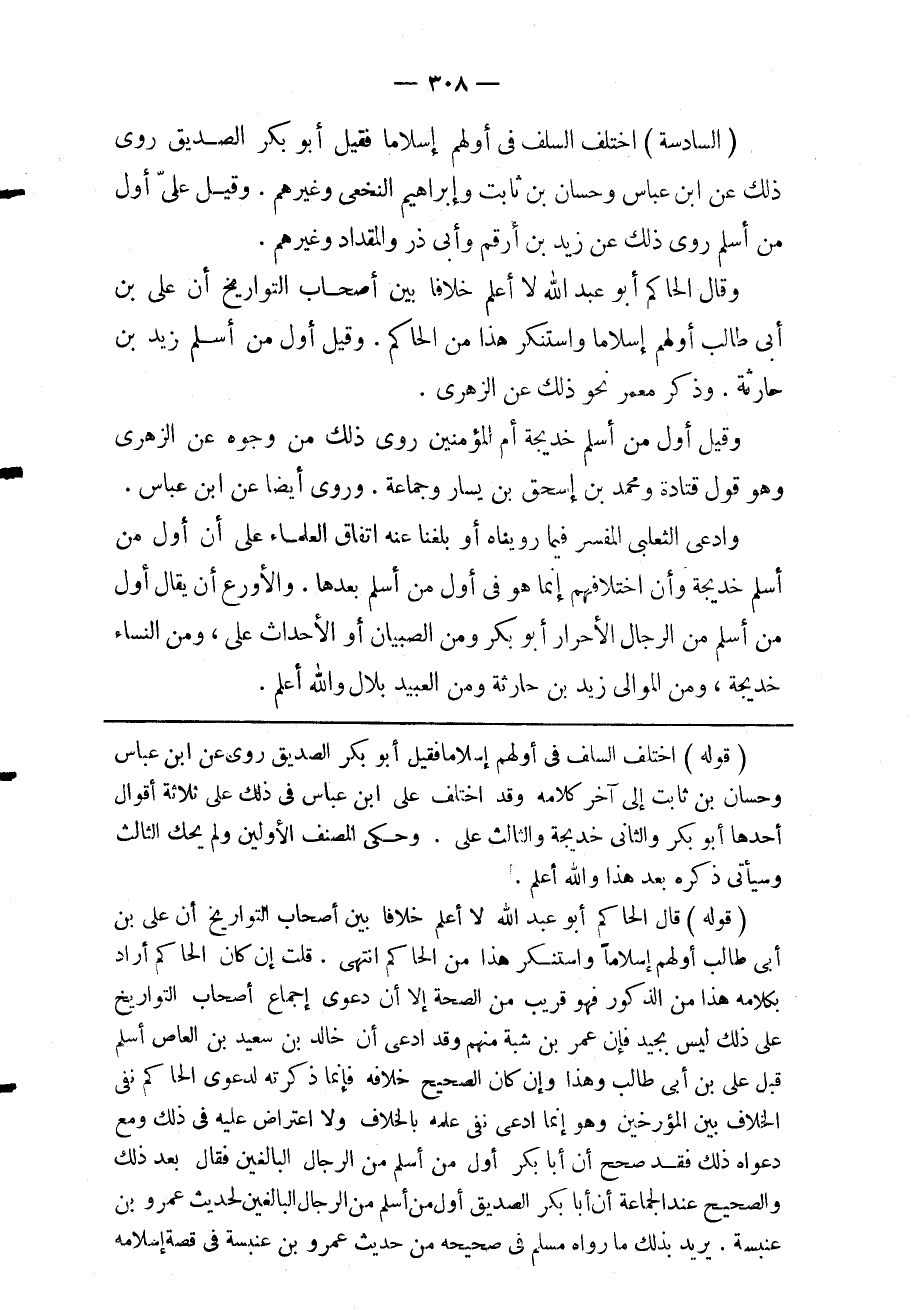 "قوله" قال الحاكم أبو عبد الله لا أعلم خلافا بين أصحاب التواريخ أن على بن أبي طالب أولهم إسلاما واستنكر هذا من الحاكم انتهى قلت إن كان الحاكم أراد بكلامه هذا من الذكور فهو قريب من الصحة إلا أن دعوى إجماع أصحاب التواريخ على ذلك ليس بجيد فإن عمر بن شبة منهم وقد ادعى أن خالد بن سعيد بن العاص أسلم قبل على بن أبي طالب وهذا وإن كان الصحيح خلافه فإنما ذكرته لدعوى الحاكم نفي الخلاف بين المؤرخين وهو إنما ادعى نفي علمه بالخلاف ولا اعتراض عليه في ذلك ومع دعواه ذلك فقد صحح أن أبا بكر أول من أسلم من الرجال البالغين فقال بعد ذلك والصحيح عند الجماعة أن أبا بكر الصديق أول من أسلم من الرجال البالغين لحديث عمرو بن عنبسة يريد بذلك ما رواه مسلم في صحيحه من حديث عمرو بن عنبسة في قصة إسلامه.